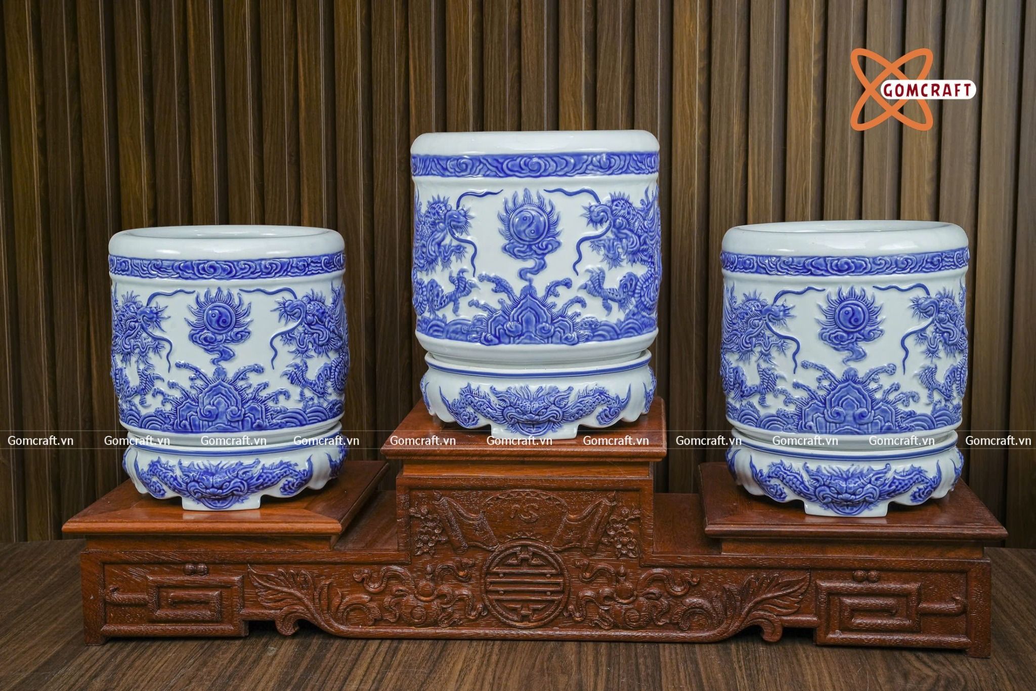 Bát hương Bát Tràng men sứ khử đắp nổi rồng đường kính 25 cm