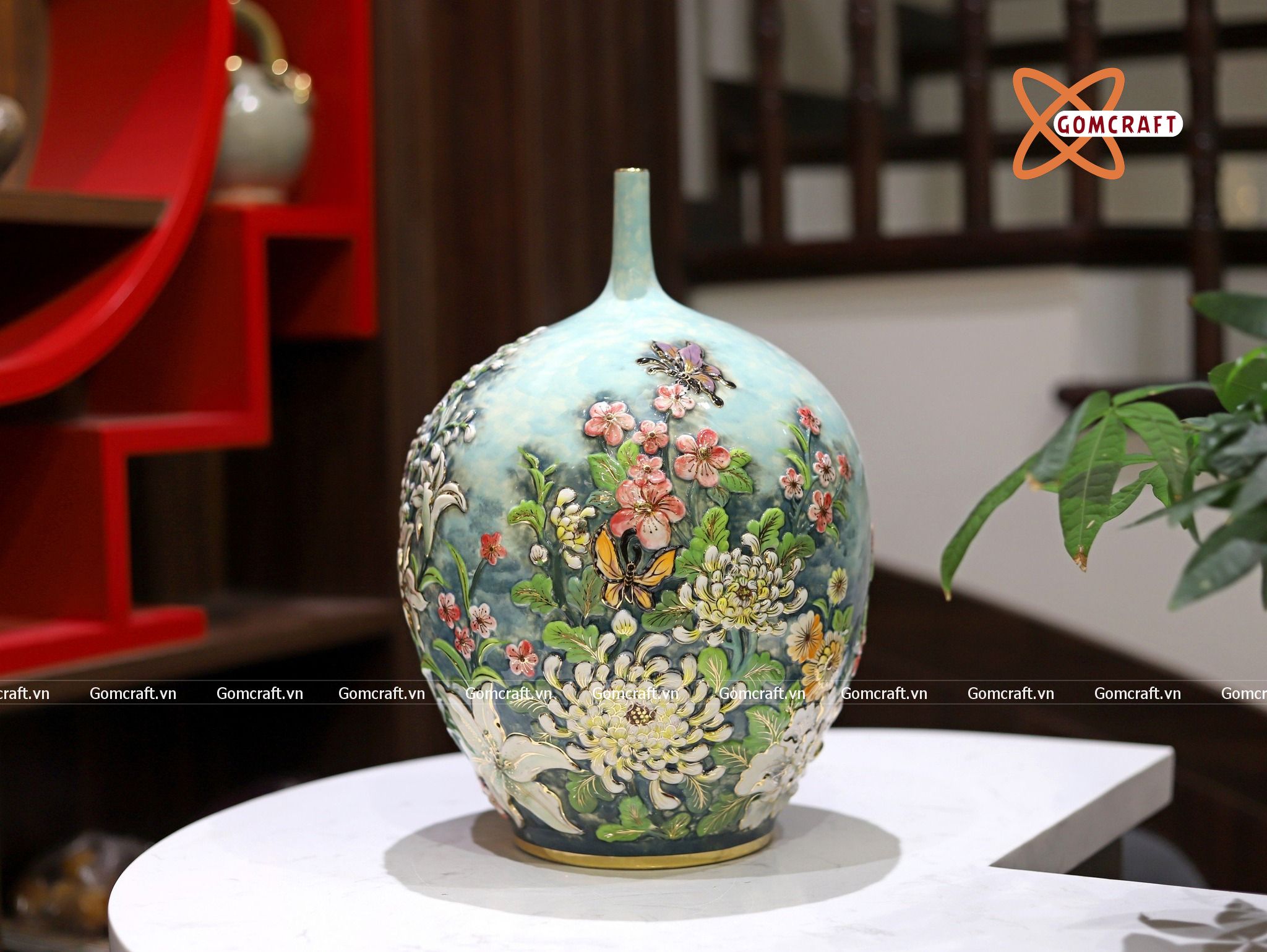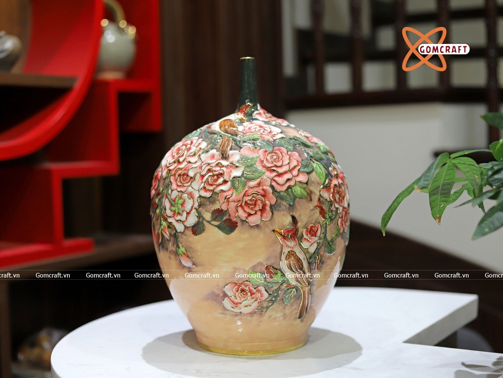 - Họa tiết tinh tế độc đáo: Lọ hoa được trang trí với nhiều họa tiết hoa văn mang ý nghĩa tốt lành, như hoa mai, hoa đào, hoa sen, hoa mẫu đơn, chim công, rồng phụng, bát mã, bát bảo, v.v.. Một số Lọ hoa còn được dát vàng 24K hoặc vẽ vàng 24K để tăng thêm vẻ sang trọng và quý phái.