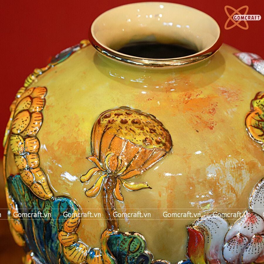 Bình Hoa men vàng họa tiết Liên Hoa Cát Tường vẽ vàng cao 36cm | Quà Tặng bình hoa Bát Tràng