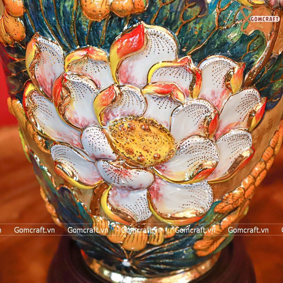 - Họa tiết tinh tế độc đáo: Lọ hoa được trang trí với nhiều họa tiết hoa văn mang ý nghĩa tốt lành, như hoa mai, hoa đào, hoa sen, hoa mẫu đơn, chim công, rồng phụng, bát mã, bát bảo, v.v.. Một số lọ hoa còn được dát vàng 24K hoặc vẽ vàng 24K để tăng thêm vẻ sang trọng và quý phái.