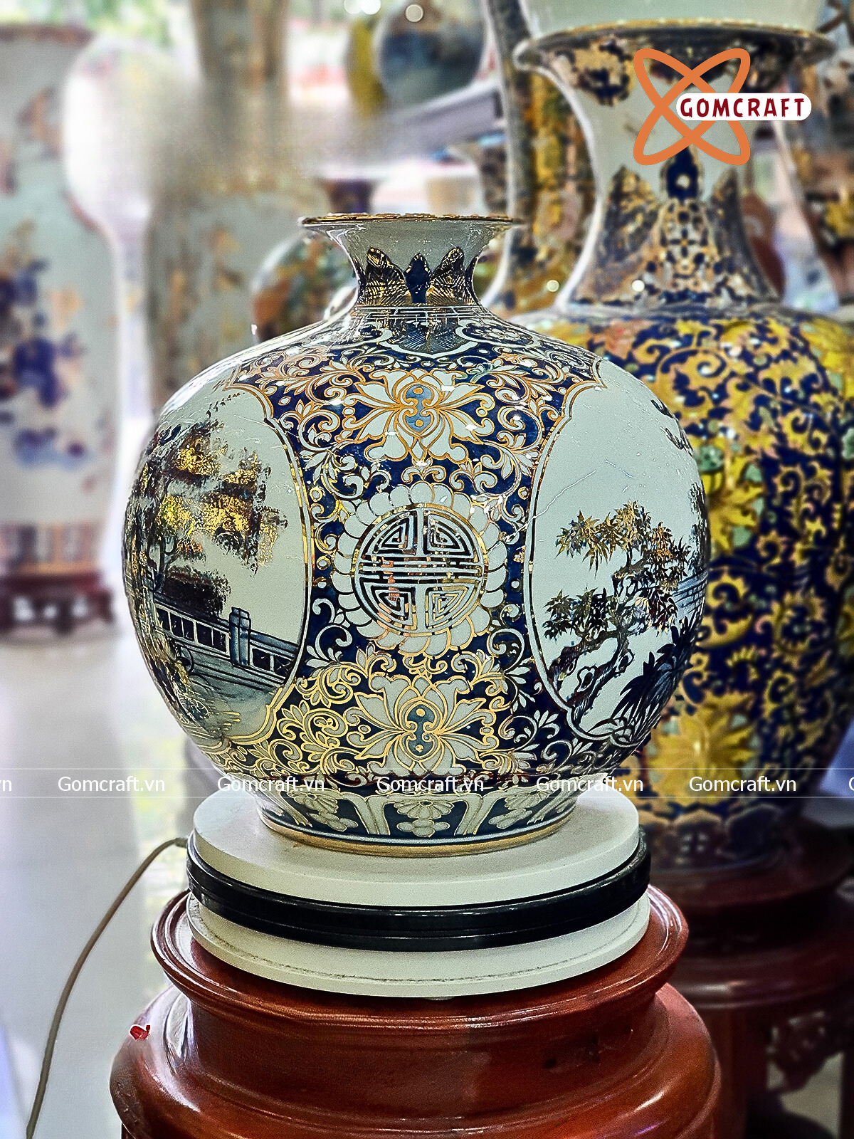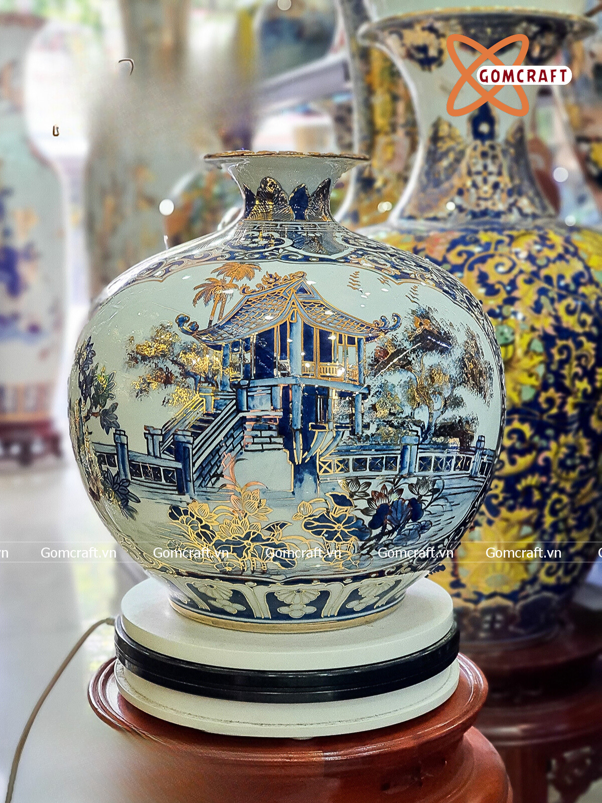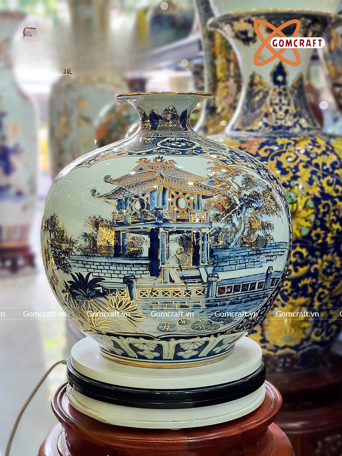 Bình Hút Lộc Bát Tràng nhị cảnh Văn Miếu Quốc Tử Giám Chùa Một Cột men lam vẽ vàng | Quà Tặng Khai Trương bình hút lộc Bát Tràng