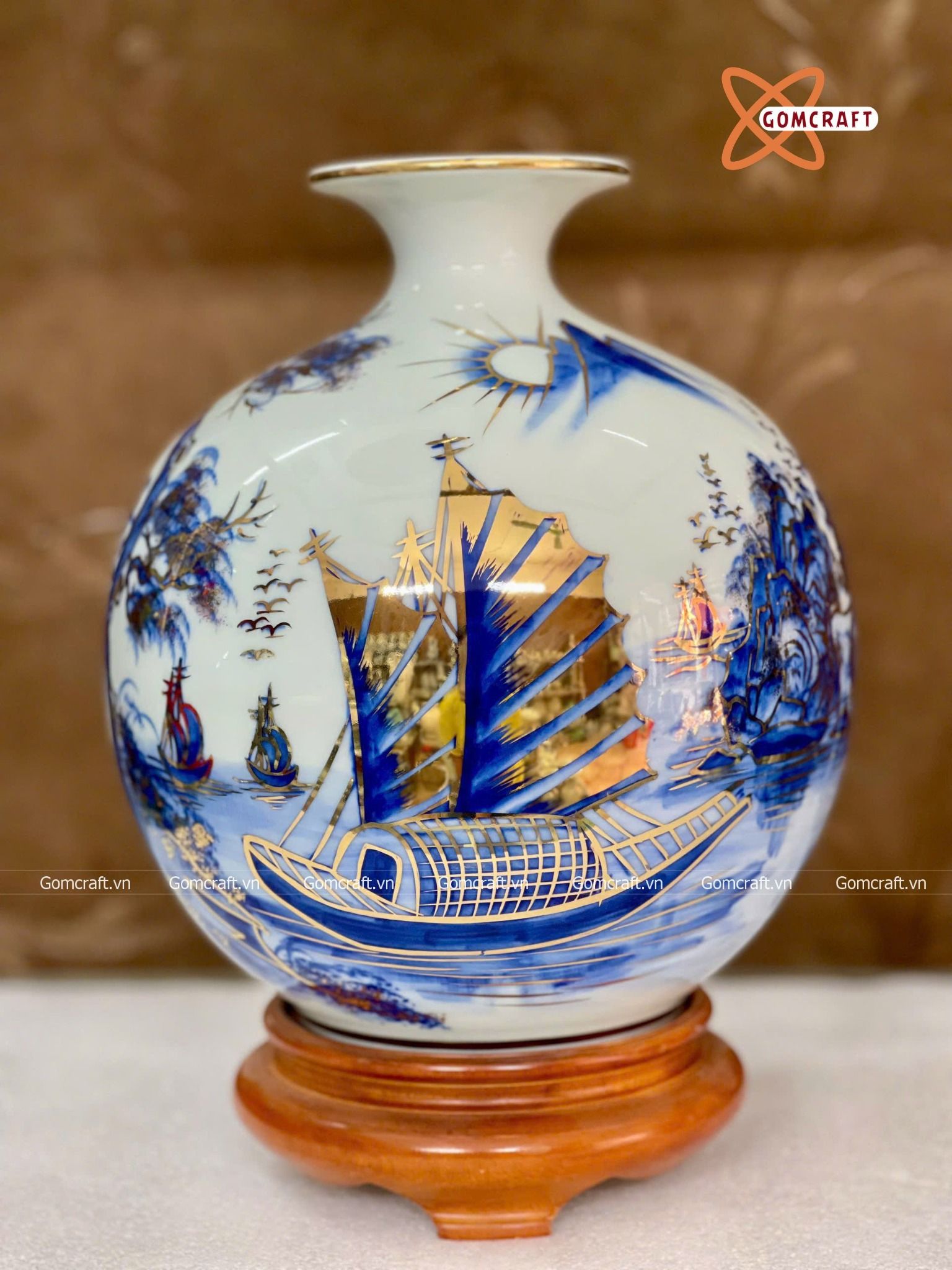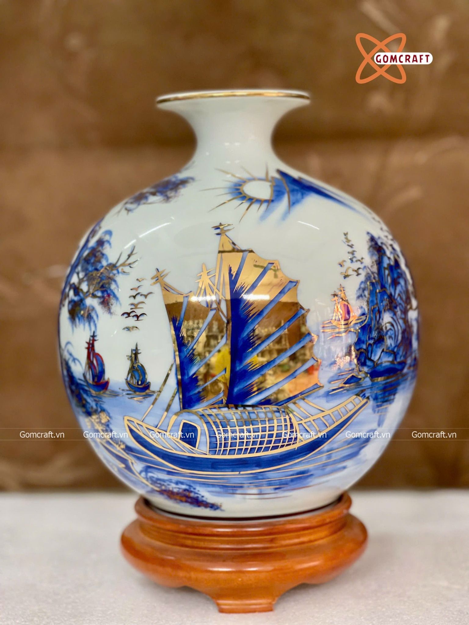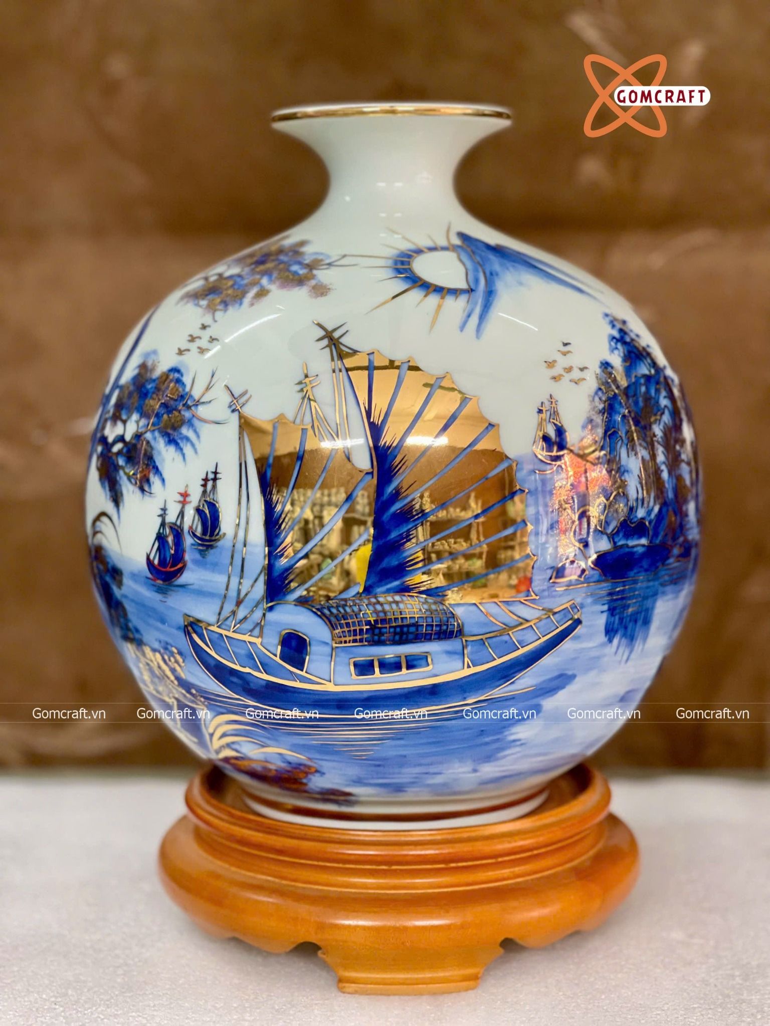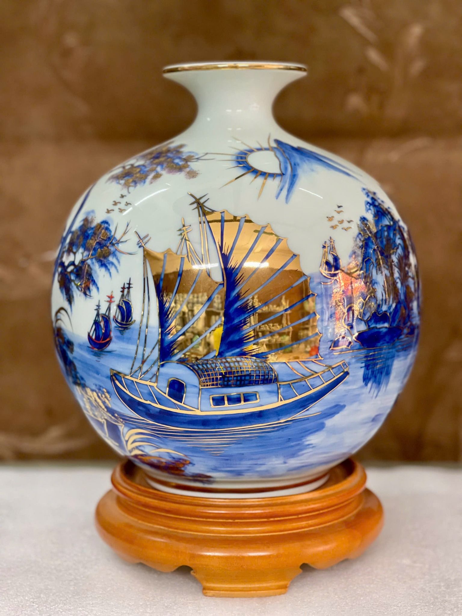 Bình Hút Lộc Bát Tràng Thuận Buồm Xuôi Gió men lam vẽ vàng | Quà Tặng Khai Trương bình hút lộc Bát Tràng