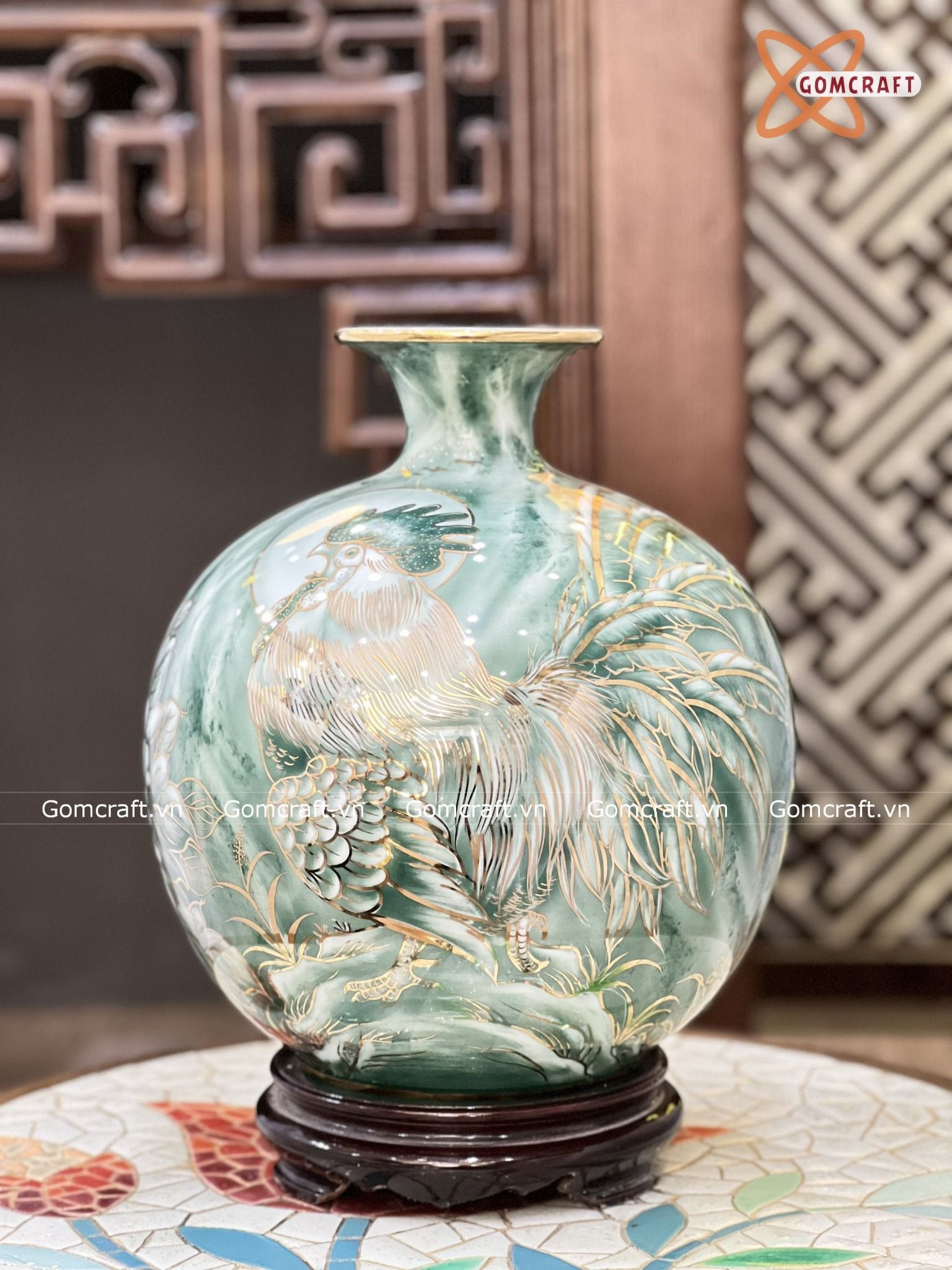 Bình Hút Lộc vẽ vàng Kim Kê Đại Cát vân đá xanh lục cao 30cm bụng 28cm | Quà Tặng Khai Trương bình hút lộc Bát Tràng