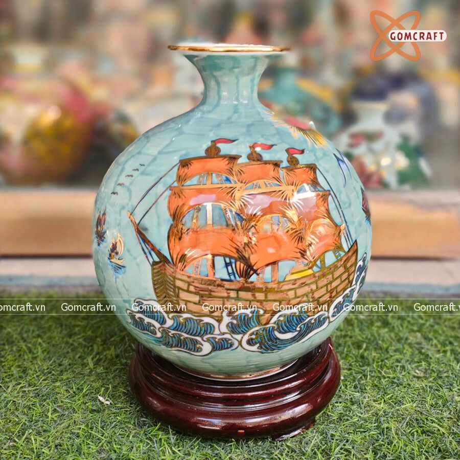 Bình Hút Lộc họa tiết Thuận Buồm Xuôi Gió men màu vẽ vàng cao 30cm | Quà Tặng Khai Trương bình hút lộc Bát Tràng