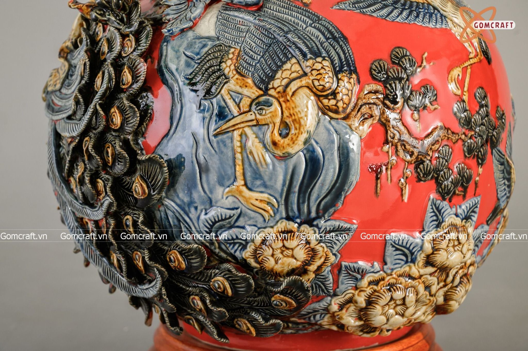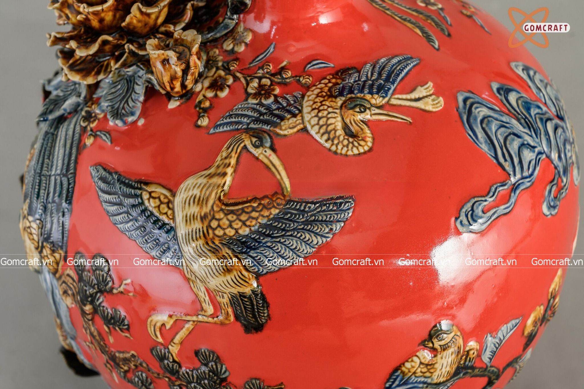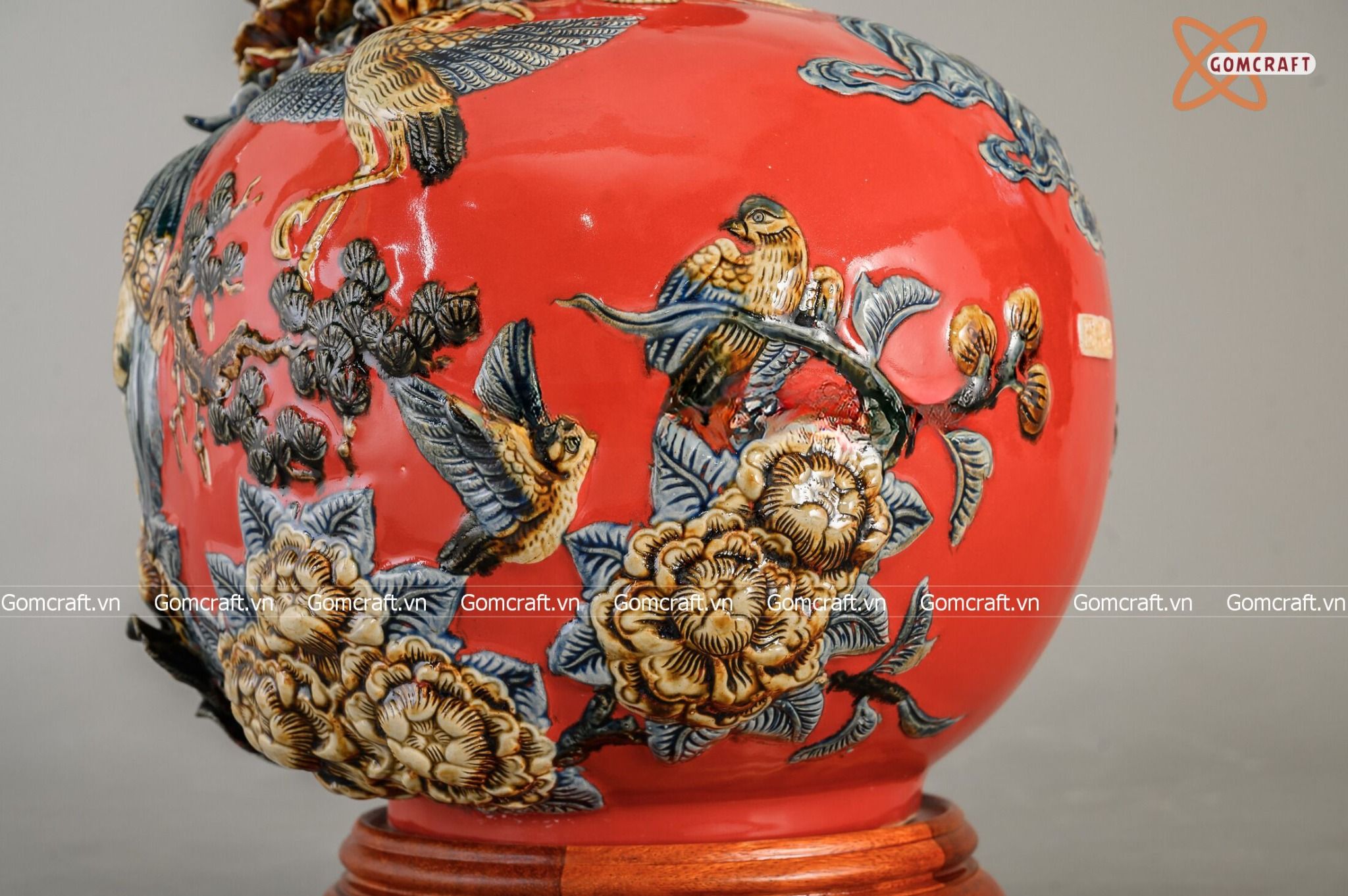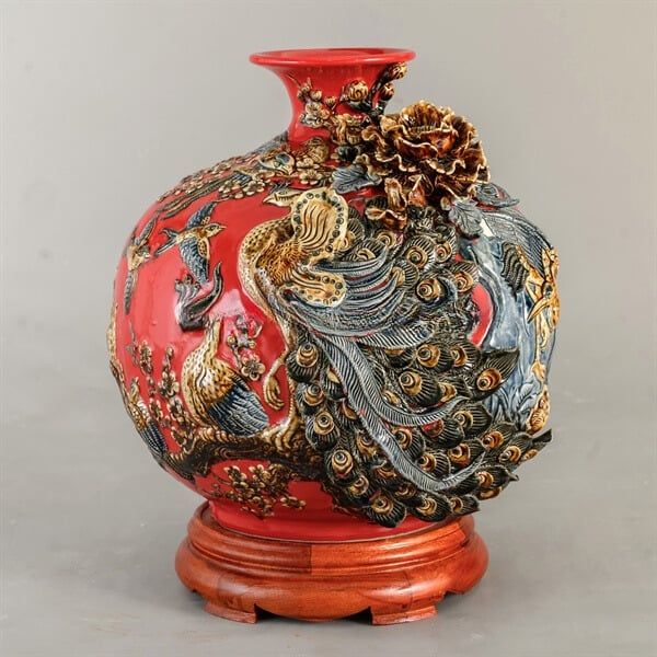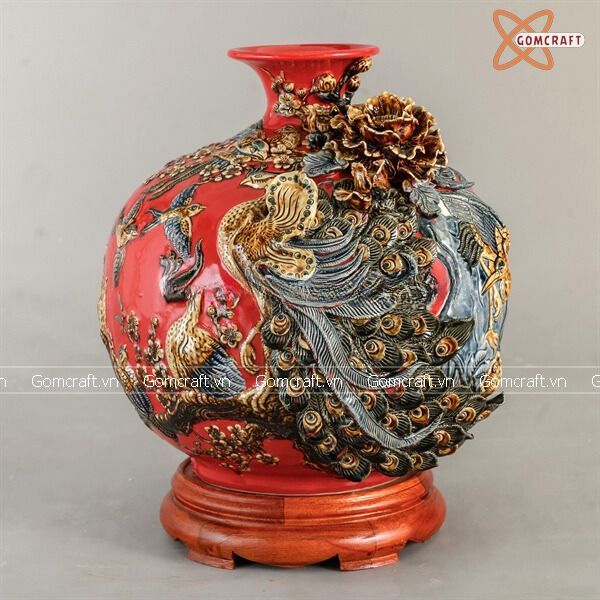 Bình Hút Lộc men đỏ họa tiết Công Danh Phú Quý đắp nổi cao 30cm | Quà Tặng Khai Trương bình hút lộc Bát Tràng