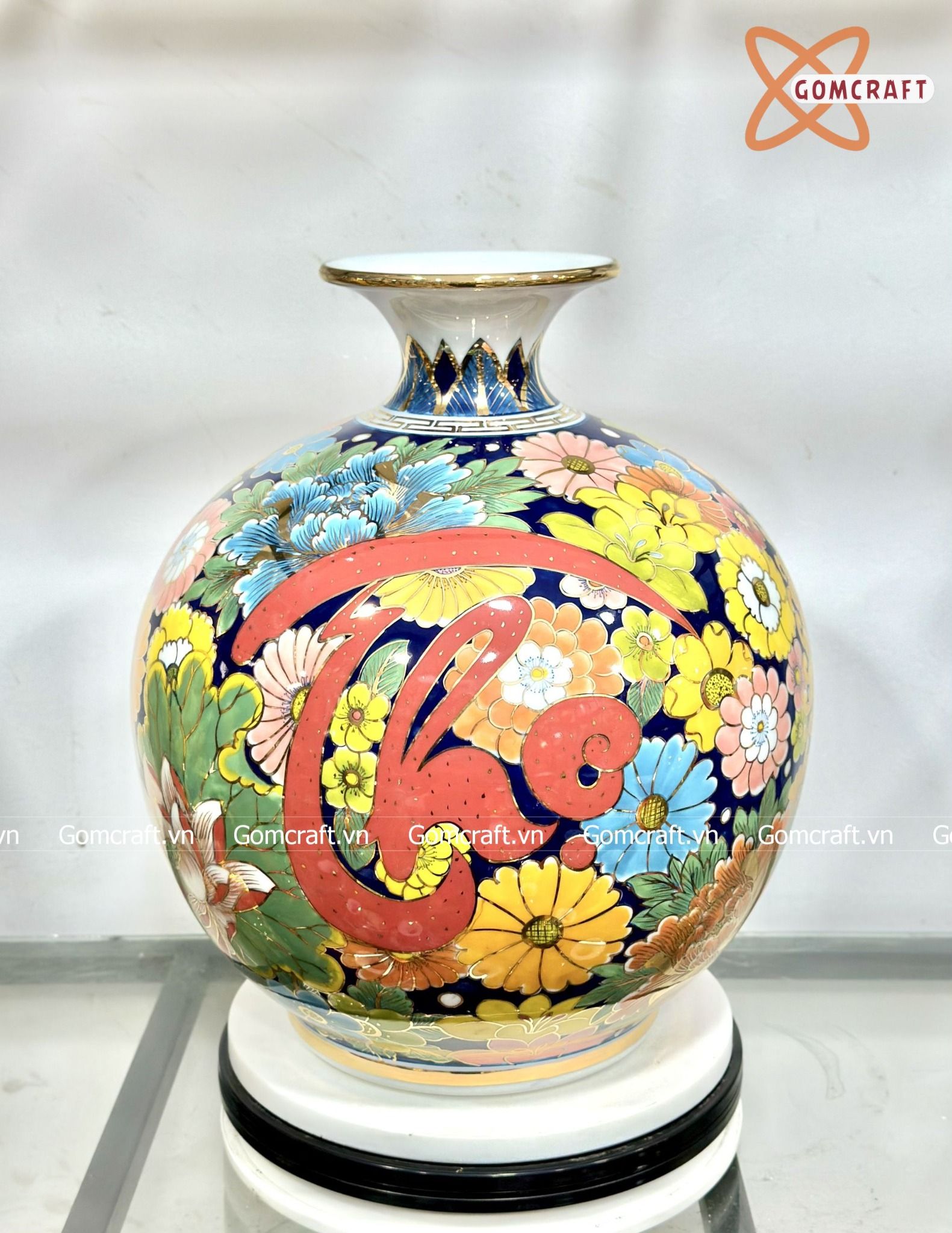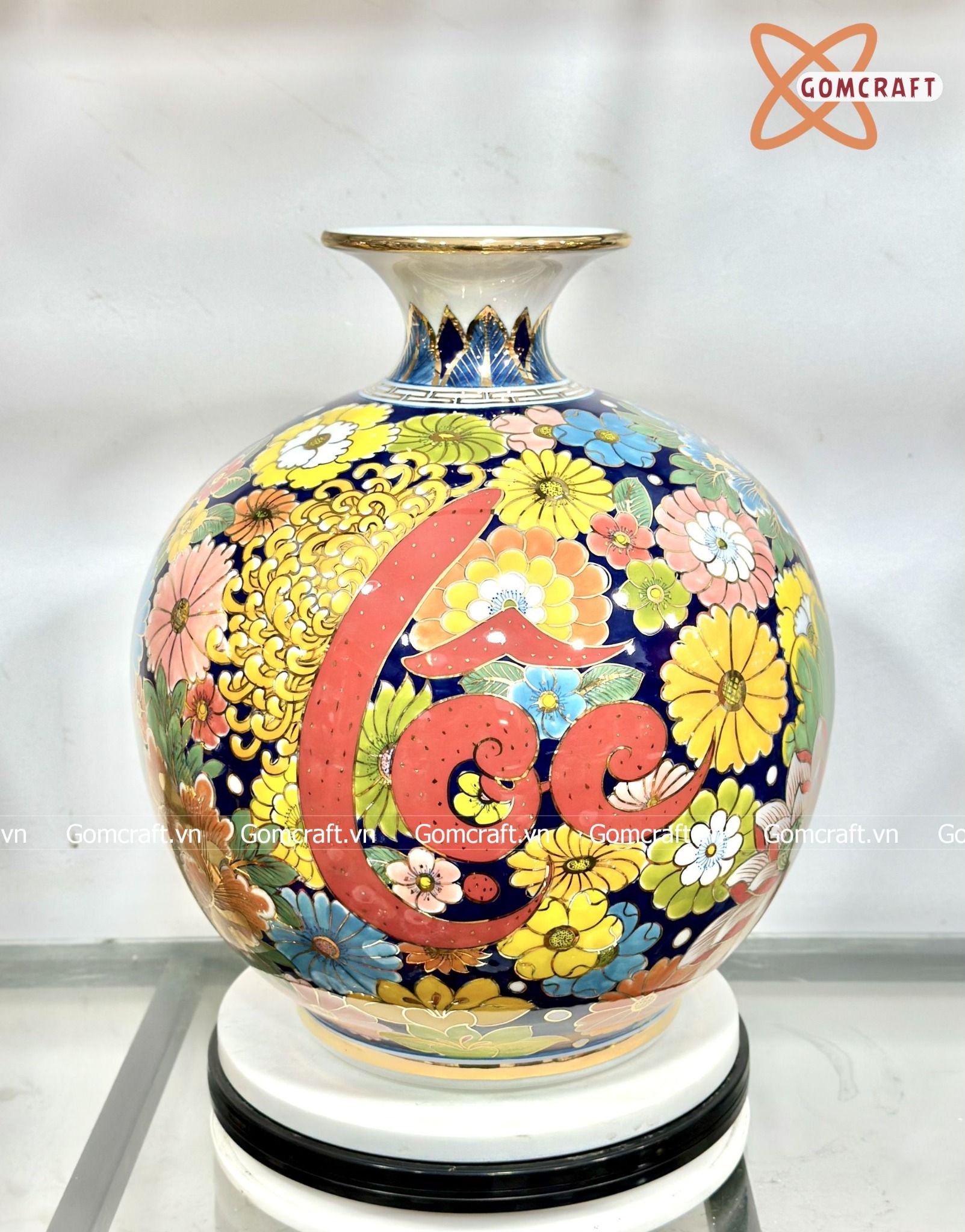 Bình Hút Lộc men màu Ngàn Hoa Phúc Lộc Thọ vẽ vàng cao 35cm | Quà Tặng Khai Trương bình hút lộc Bát Tràng