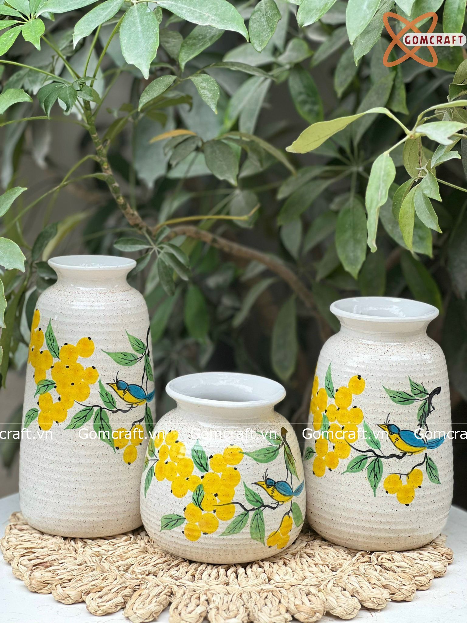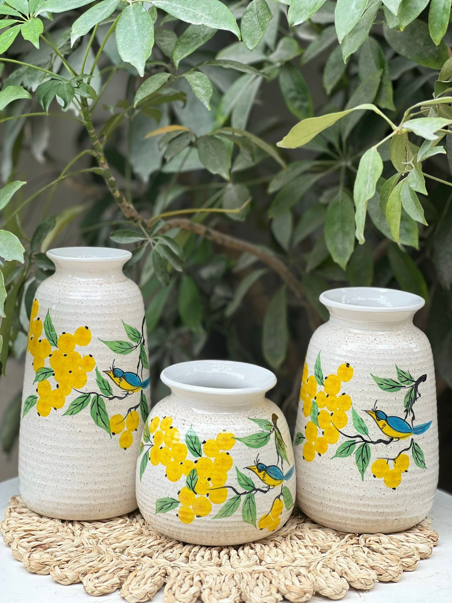 Bộ 3 Bình Hoa Vẽ Tay gốm sứ Bát Tràng họa tiết Quả Mọng Vàng | Quà Tặng bình hoa Bát Tràng