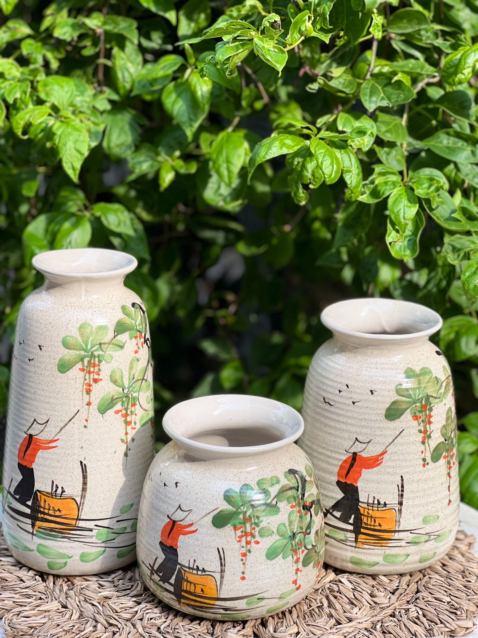 Bộ 3 Bình Hoa Vẽ Tay gốm sứ Bát Tràng họa tiết Sông Quê | Quà Tặng bình hoa Bát Tràng