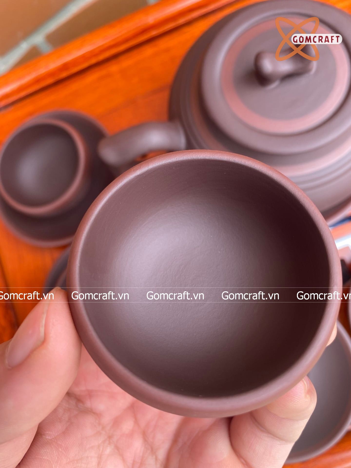 Ấm Chén Bát Tràng gốm Tử Sa dáng Trống Đai Gụ chỉ đỏ lòng mộc 300ml | Quà Tặng Doanh Nghiệp bộ ấm chén uống trà