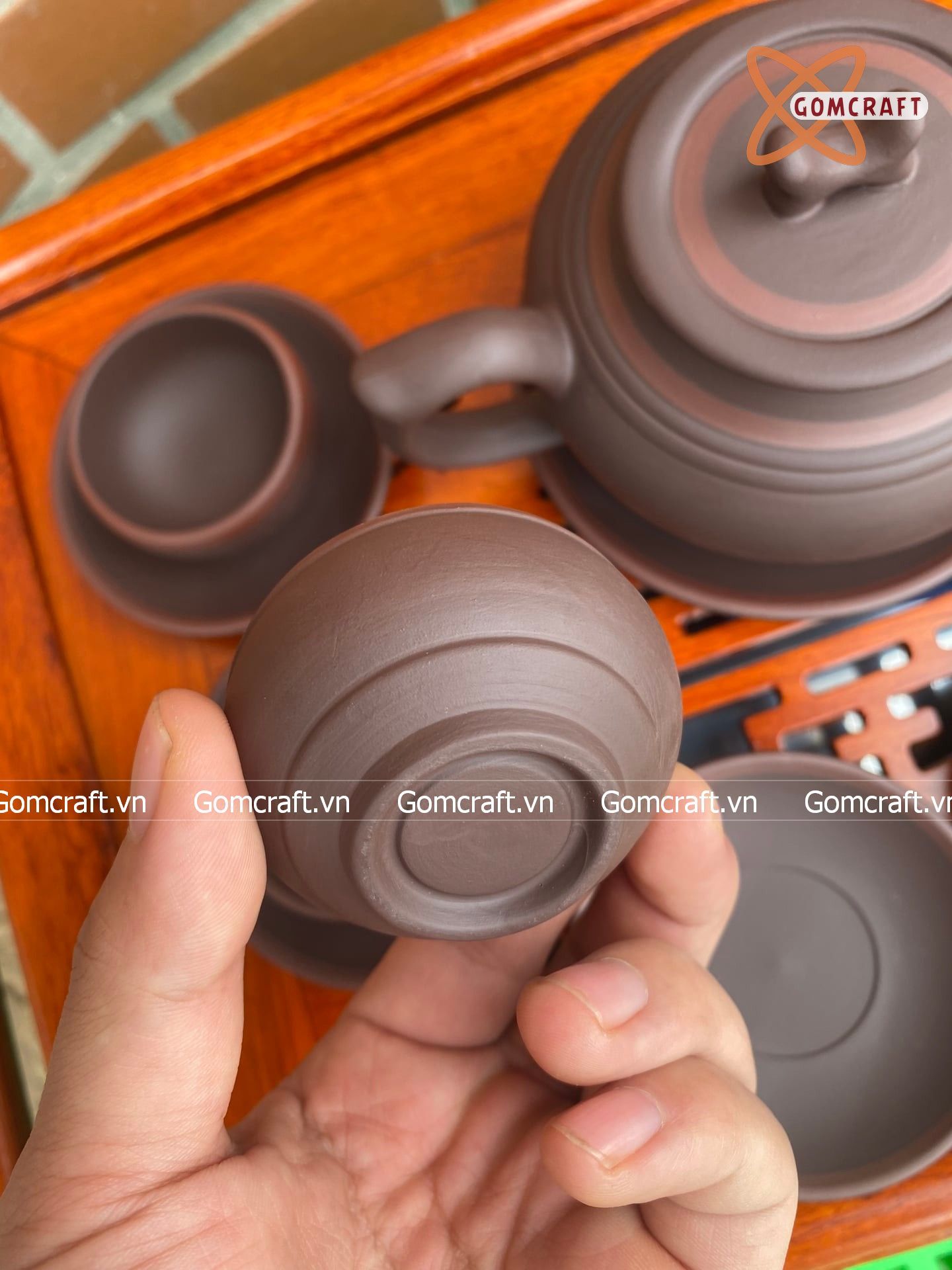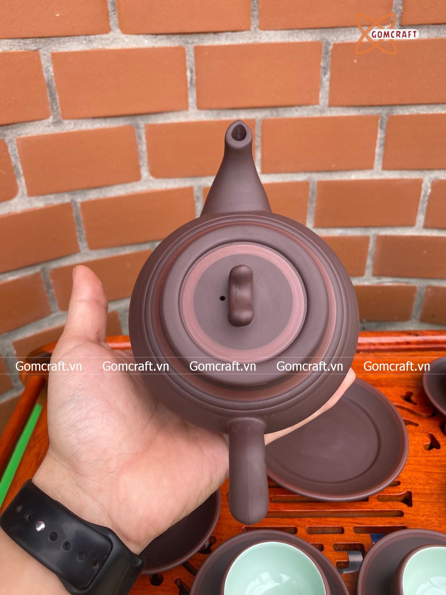 Ấm Chén Bát Tràng gốm Tử Sa dáng Trống Đai Gụ chỉ đỏ lòng xanh 300ml | Quà Tặng Doanh Nghiệp bộ ấm chén uống trà
