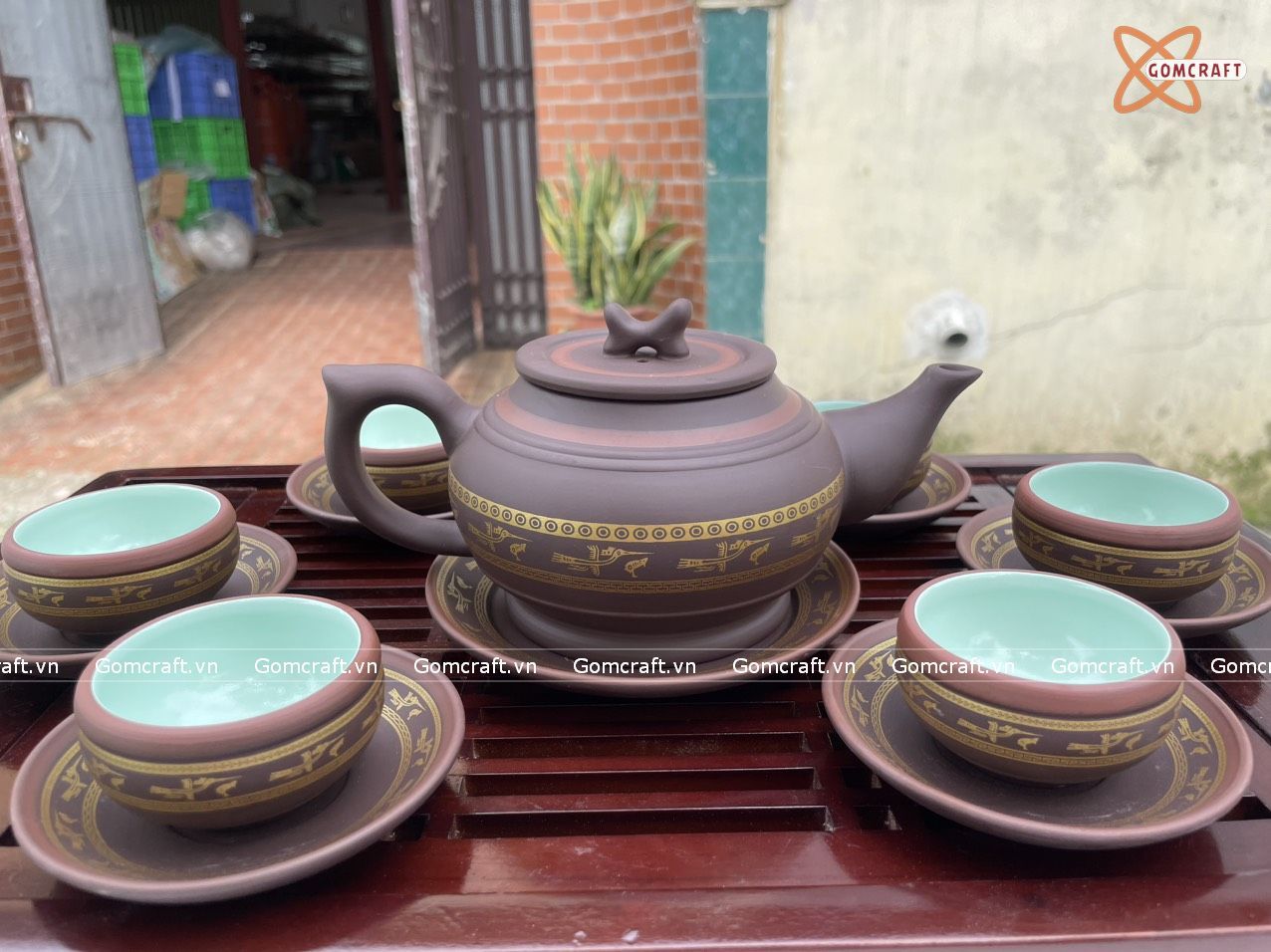 Ấm Chén Bát Tràng gốm Tử Sa họa tiết Âu Lạc dáng Trống Đai Gụ chỉ đỏ lòng xanh 300ml | Quà Tặng Doanh Nghiệp bộ ấm chén uống trà