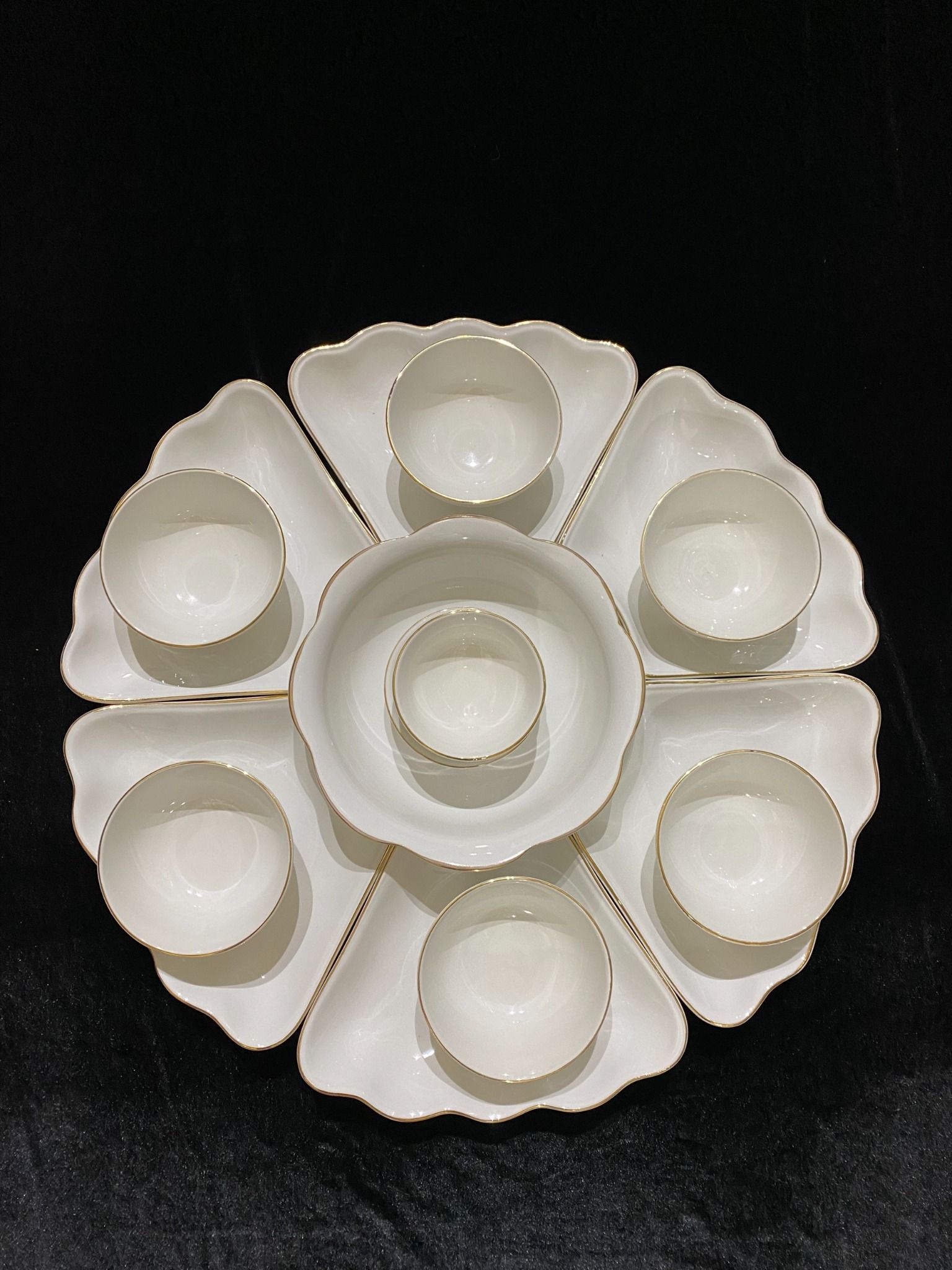 - Họa tiết tinh tế độc đáo: Bộ bát đĩa được trang trí với nhiều họa tiết hoa văn mang ý nghĩa tốt lành, như hoa mai, hoa đào, hoa sen, hoa mẫu đơn, chim công, rồng phụng, v.v.. Một số loại còn được dát vàng 24K hoặc vẽ vàng 24K để tăng thêm vẻ sang trọng và quý phái.