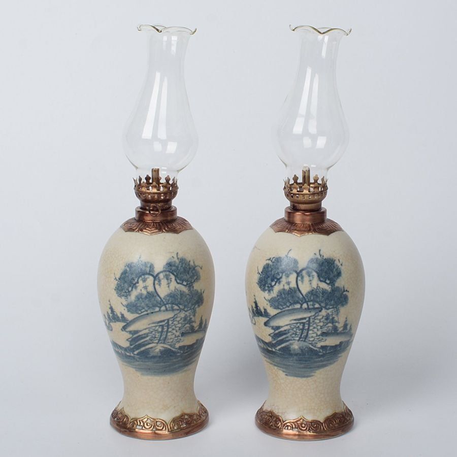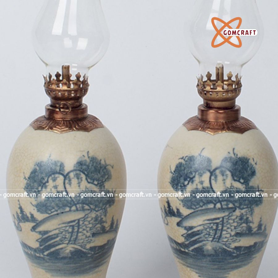 Đèn dầu men rạn vẽ đồng quê dáng đùi dế 30cm
