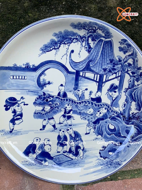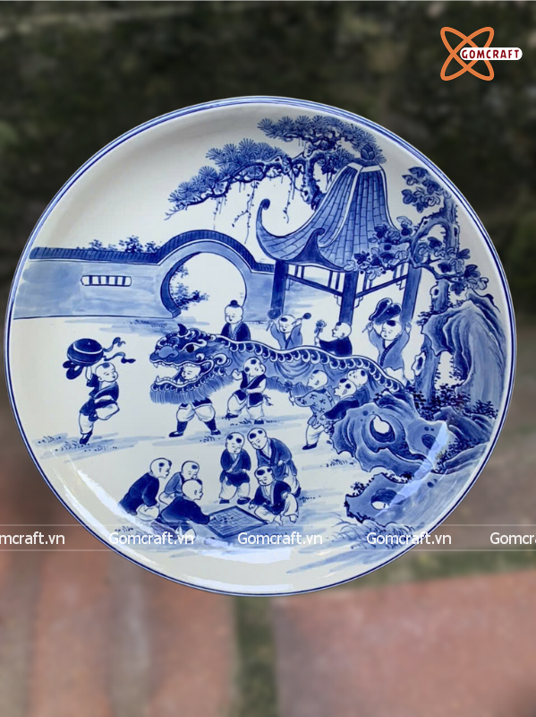 Đĩa cảnh phong thuỷ Bách Nhi Bách Phúc men lam đường kính 40 cm | Quà Tặng Khai Trương Đĩa Cảnh Phong Thuỷ