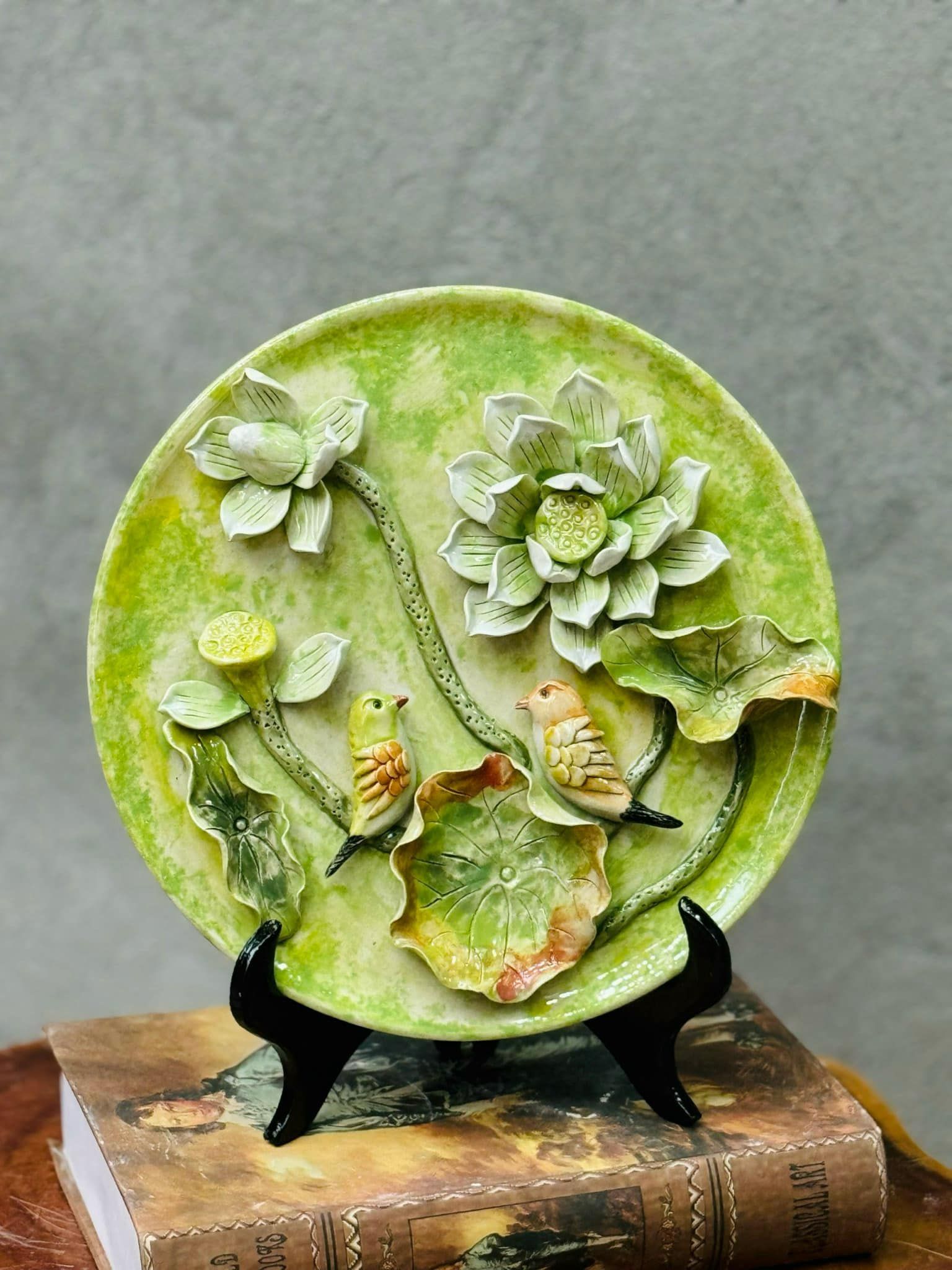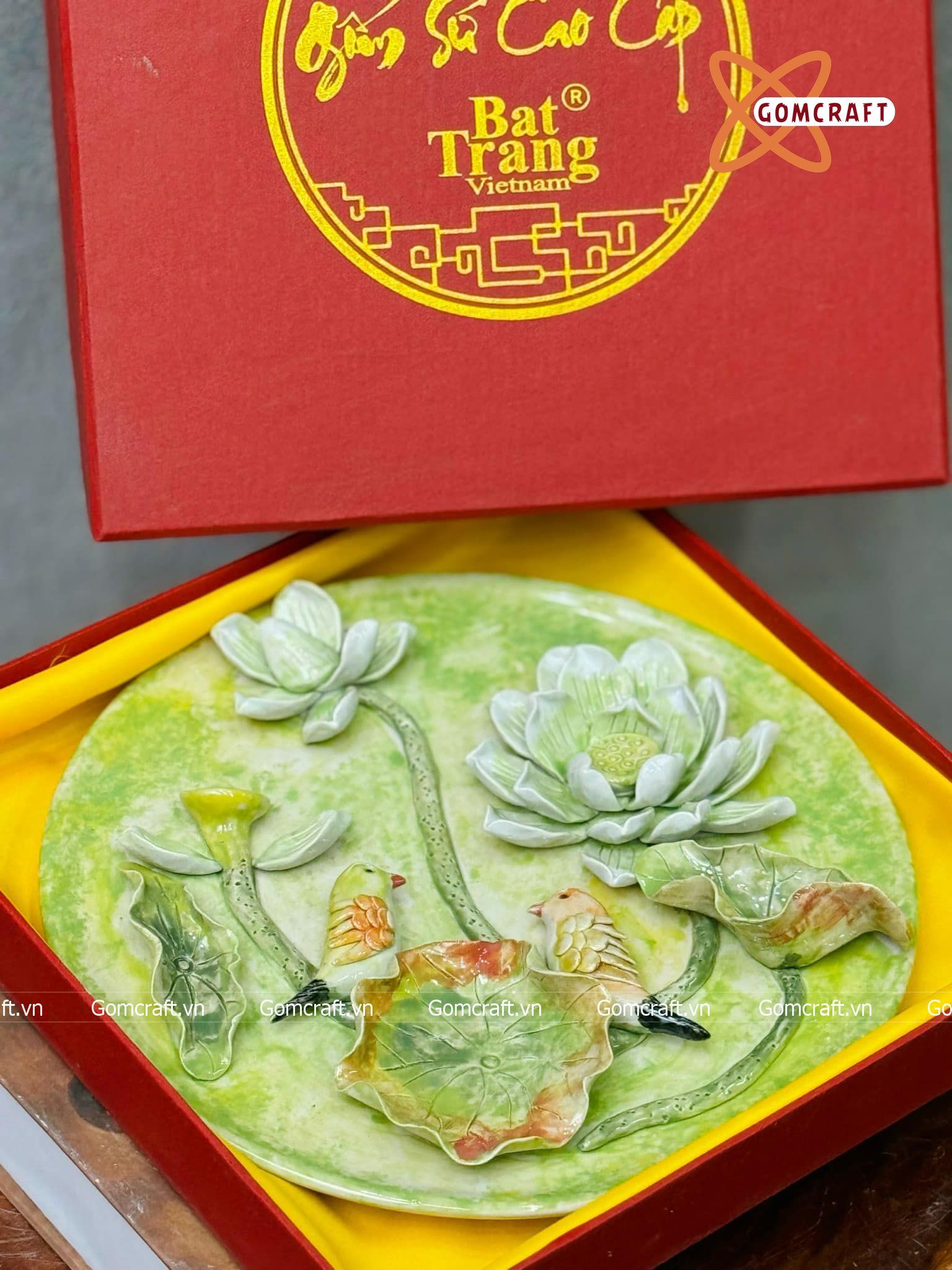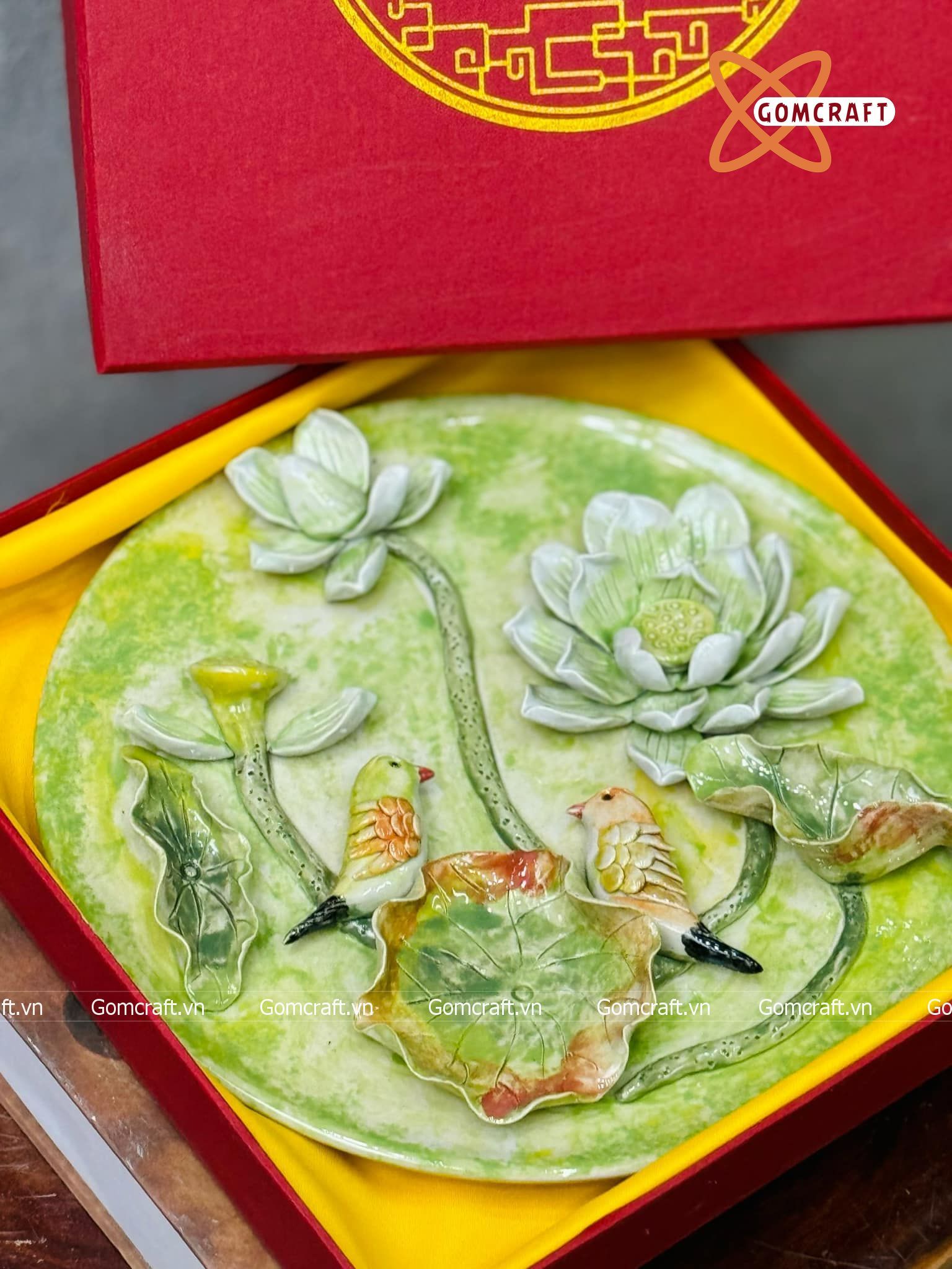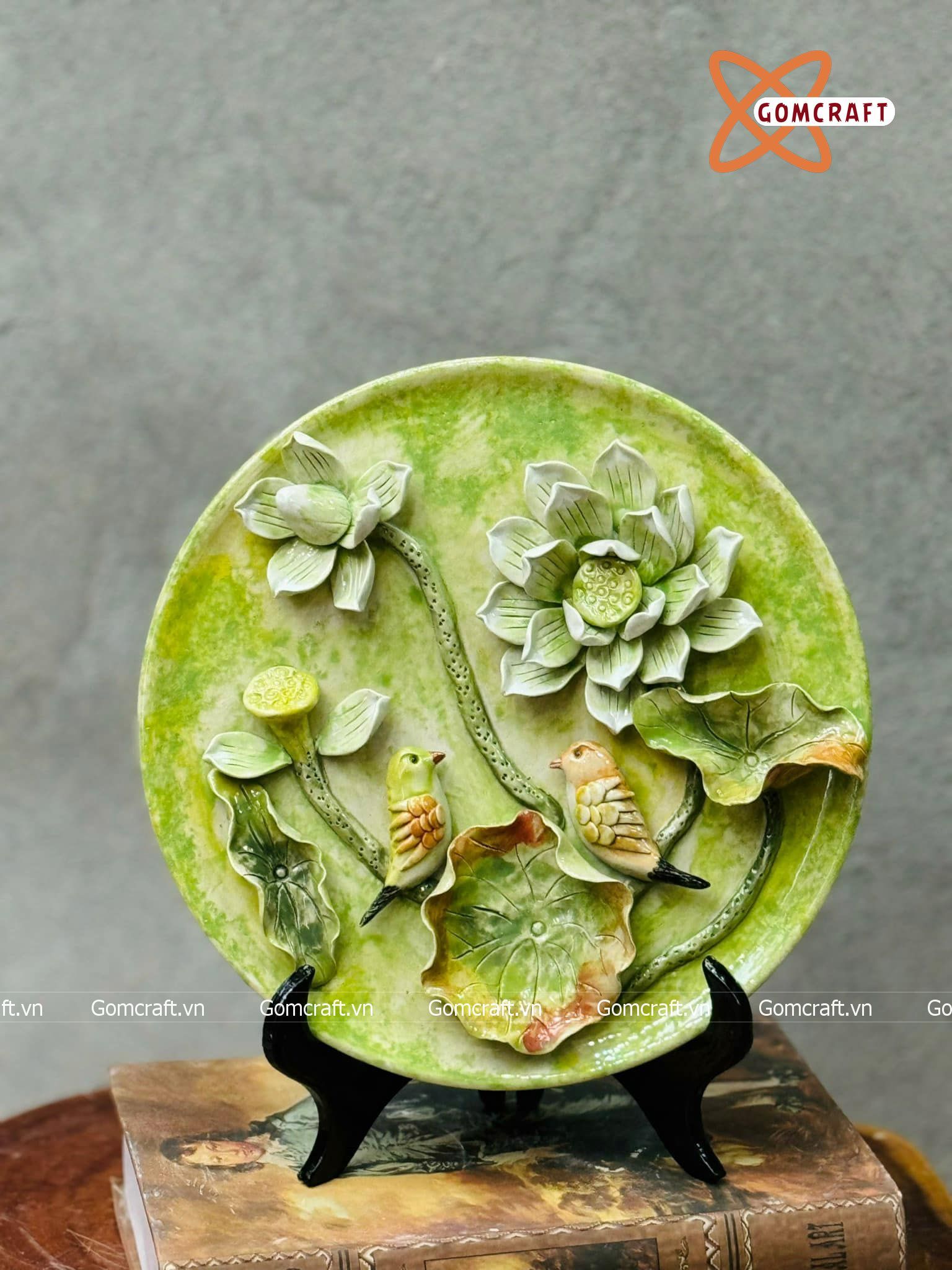 Đĩa cảnh phong thuỷ Sen Hạ đắp nổi đường kính 30 cm | Quà Tặng Khai Trương Đĩa Cảnh Phong Thuỷ