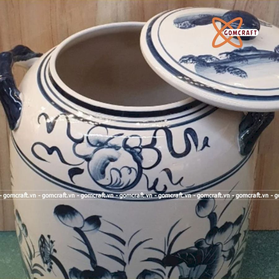 Quà tặng cao cấp Hũ gạo tài lộc nền men lam vẽ Cá Chép Hoa Sen dung tích 20 lít
