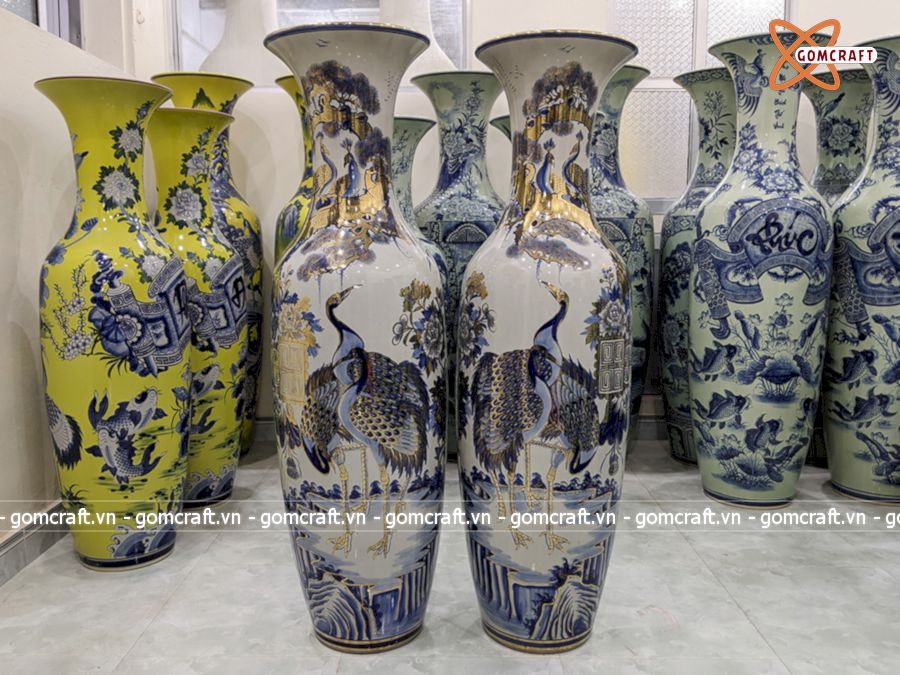 Lục Bình Bát Tràng Ngũ Phúc men lam vẽ vàng công nghệ nano 1m4 | Quà Tặng Bố lục bình Bát Tràng