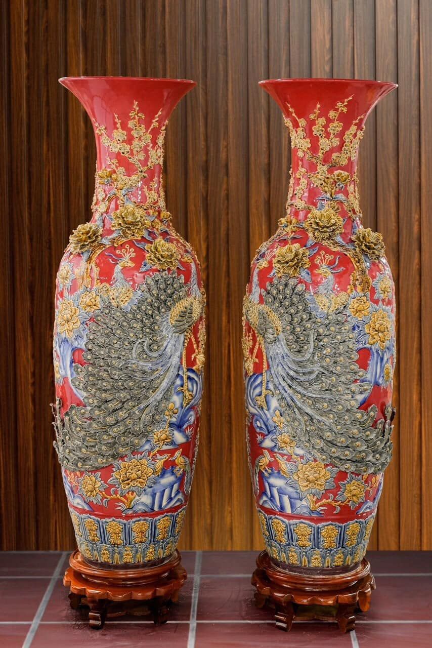 Lục Bình Bát Tràng men sứ đỏ hàng thủ công 1m4 họa tiết Công Hoa Phú Quý đắp nổi kênh bong | Quà Tặng Bố lục bình Bát Tràng