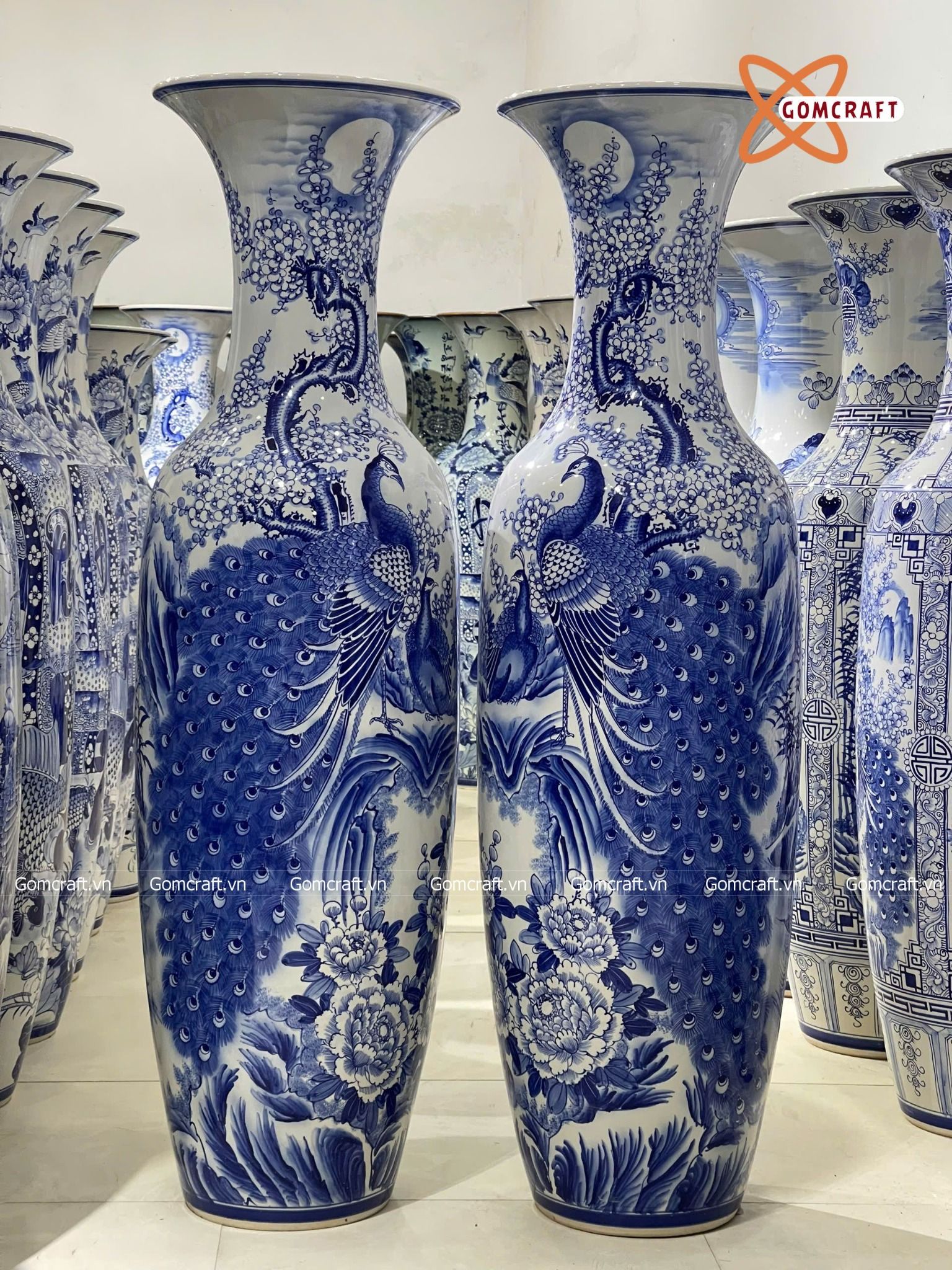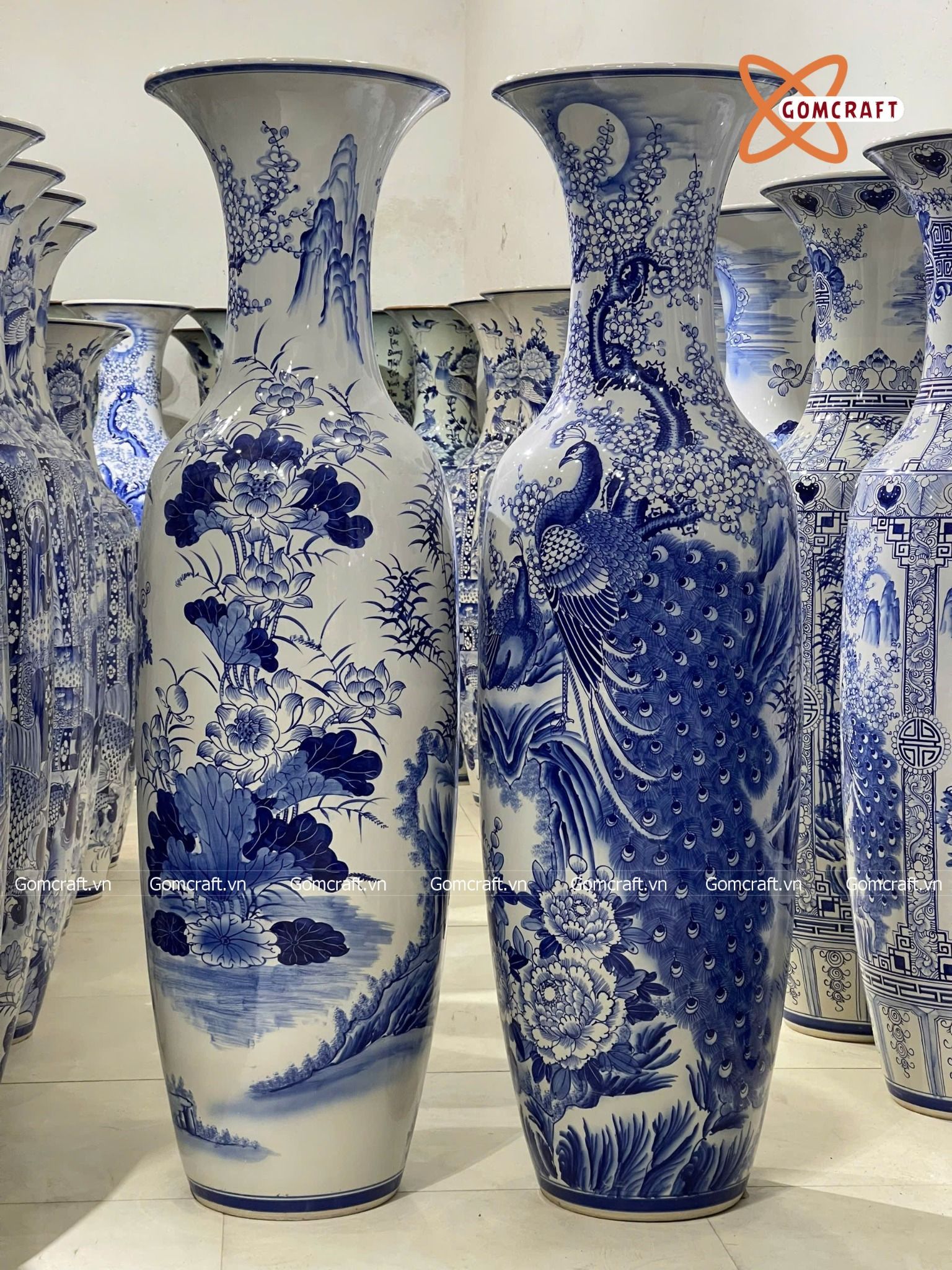 Lục bình Bát Tràng cao cấp Công Danh Phú Quý men sứ trắng vẽ kĩ dáng béo cao 1m6