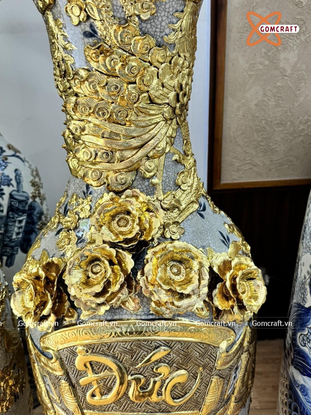 Lục bình Bát Tràng cao cấp Phúc Đức đắp nổi kênh bong dát vàng cao 1m4