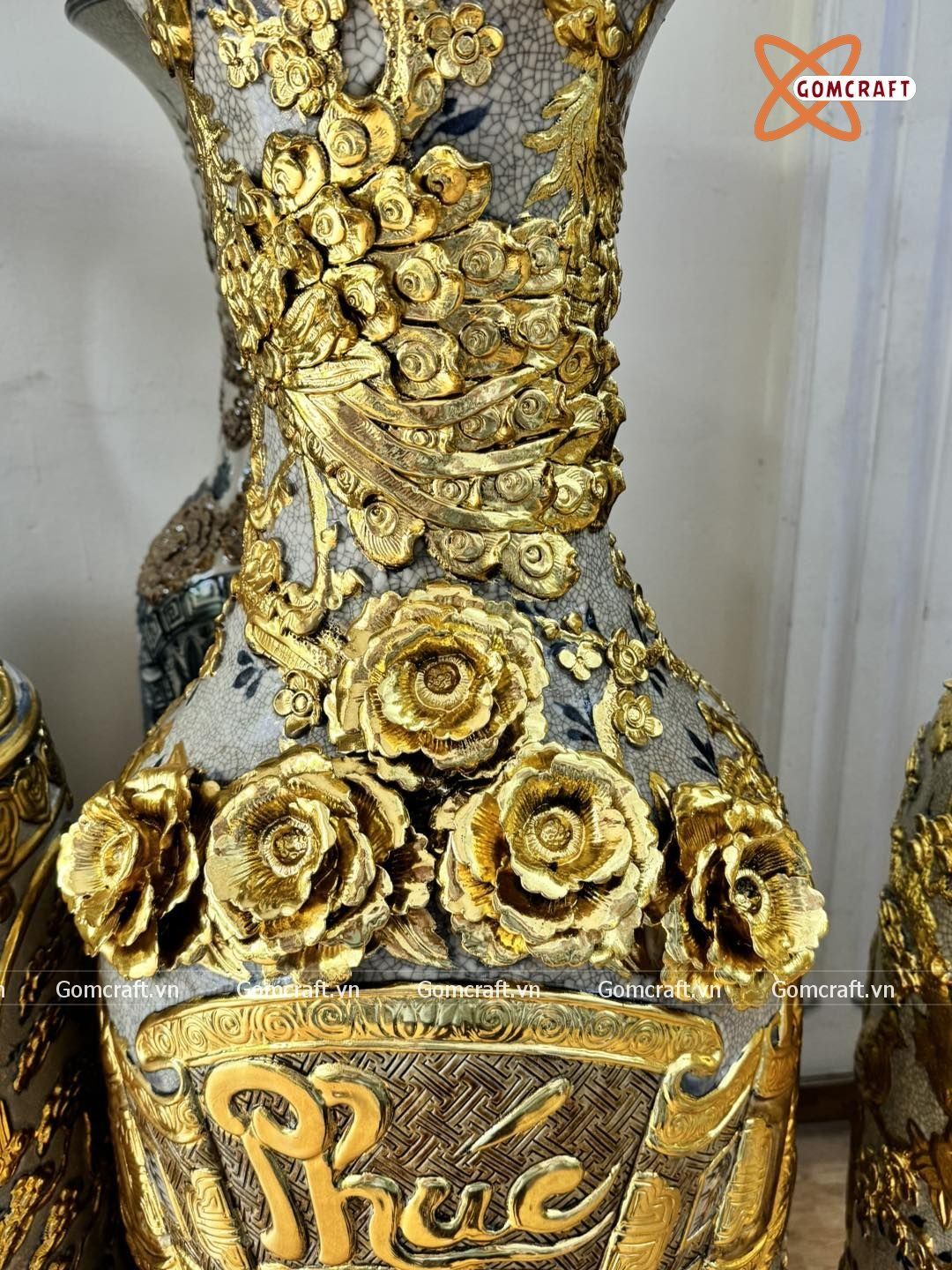 Lục bình Bát Tràng cao cấp Phúc Đức đắp nổi kênh bong dát vàng cao 1m4