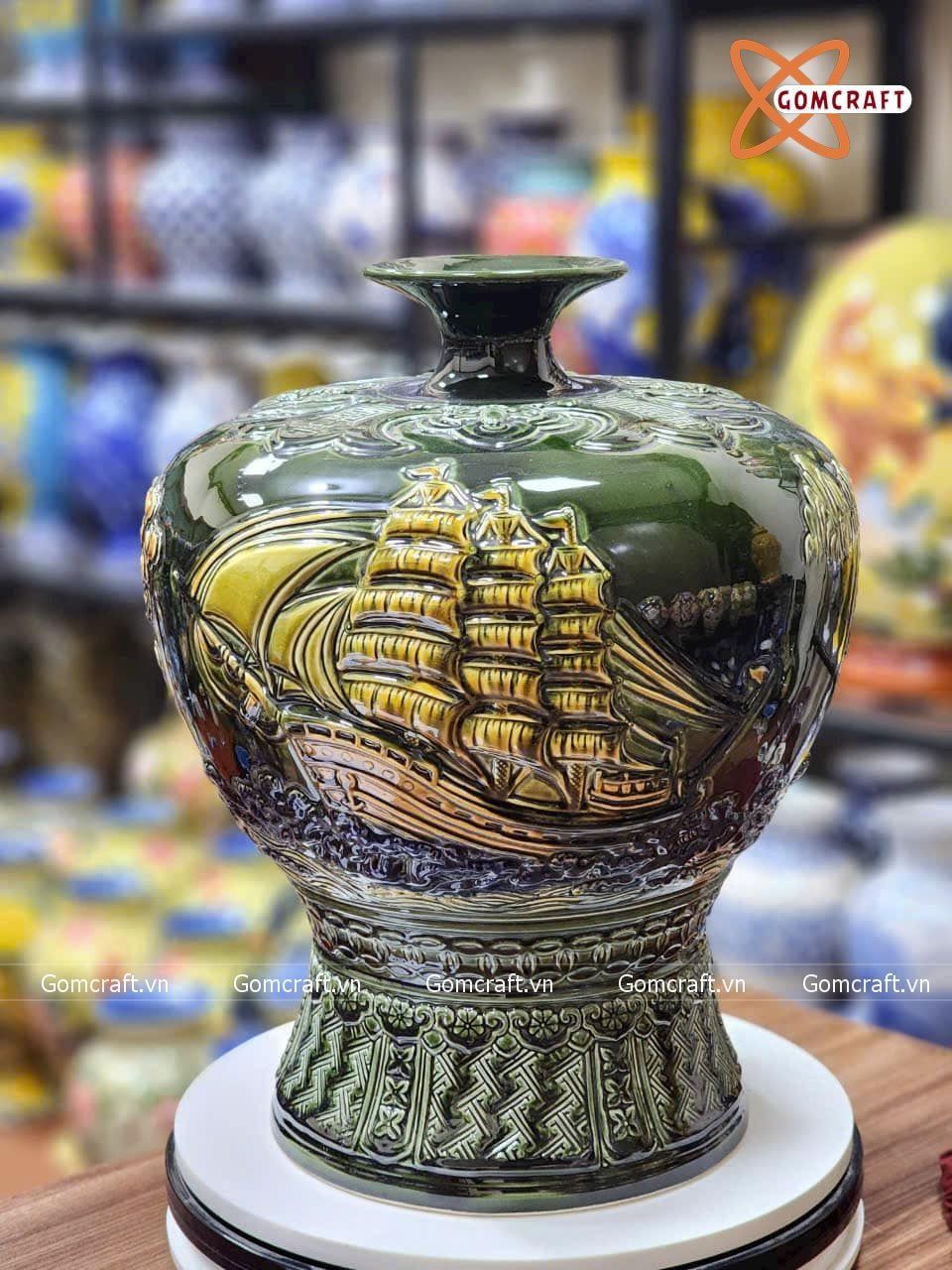 Mai Bình Tích Lộc Bát Tràng Thuận Buồm Xuôi Gió cao 30 cm men hoàng thổ đắp nổi | Quà Tặng Khai Trương Mai Bình Tích Lộc Bát Tràng