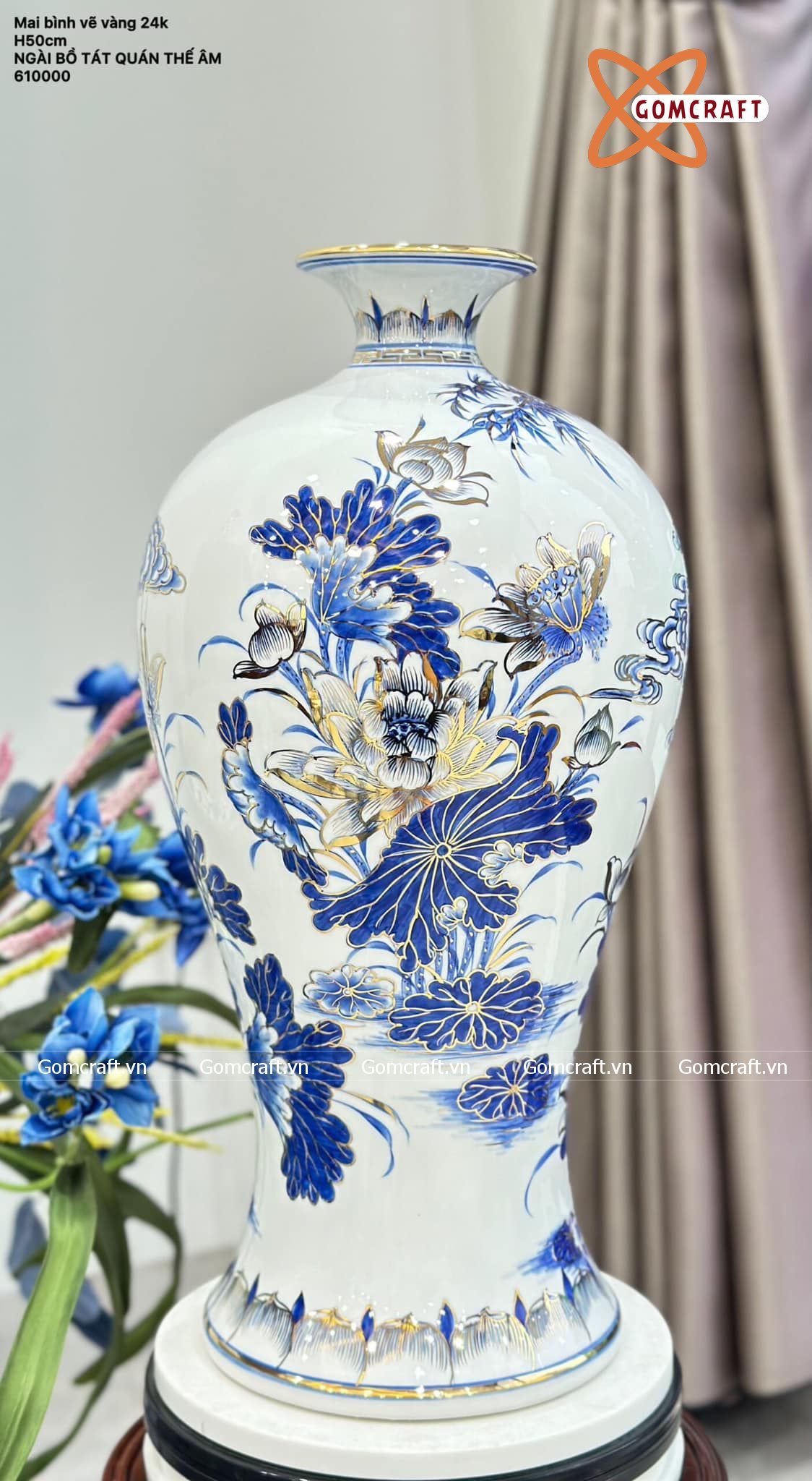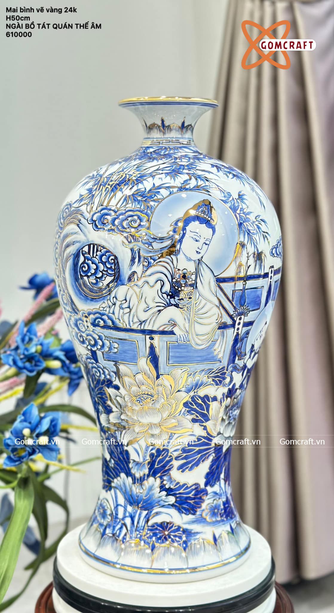 Mai Bình Tích Lộc Ngài Quan Thế Âm Bồ Tát và Ngài Đồng Tử men lam vẽ vàng cao 50 cm | Quà Tặng Khai Trương Mai Bình Tích Lộc Bát Tràng