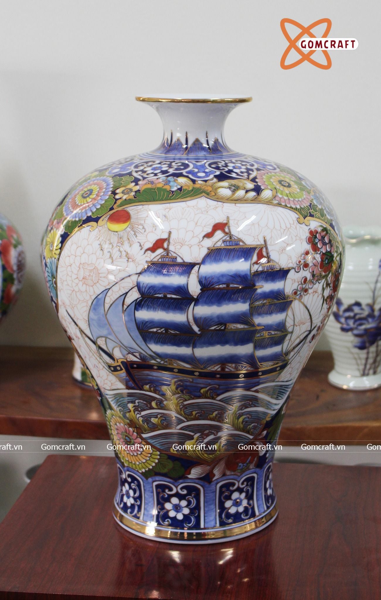Mai Bình Tích Lộc nhị cảnh Thuận Buồm Xuôi Gió Công Danh Phú Quý vẽ vàng cao 38 cm | Quà Tặng Khai Trương Mai Bình Tích Lộc Bát Tràng