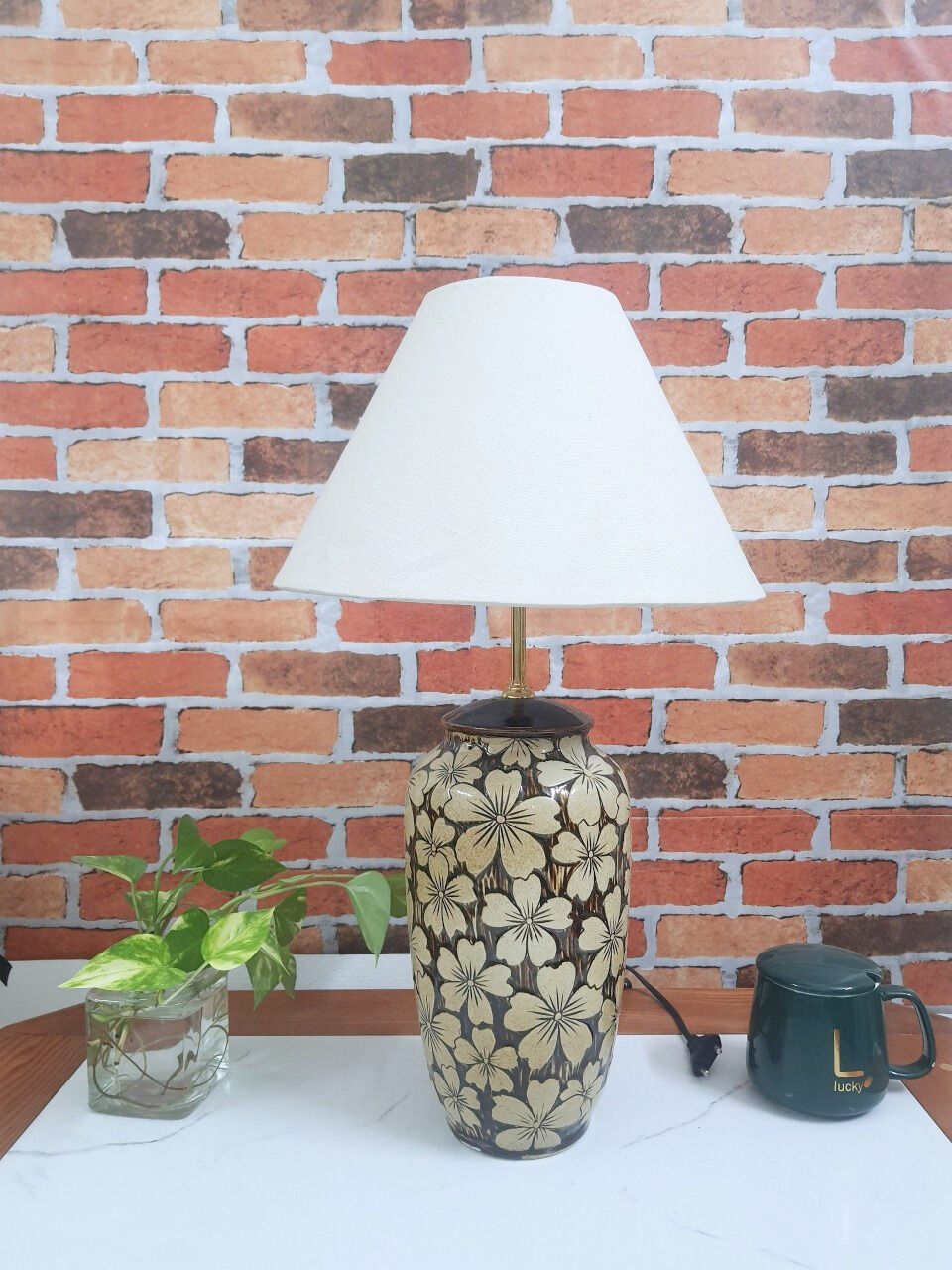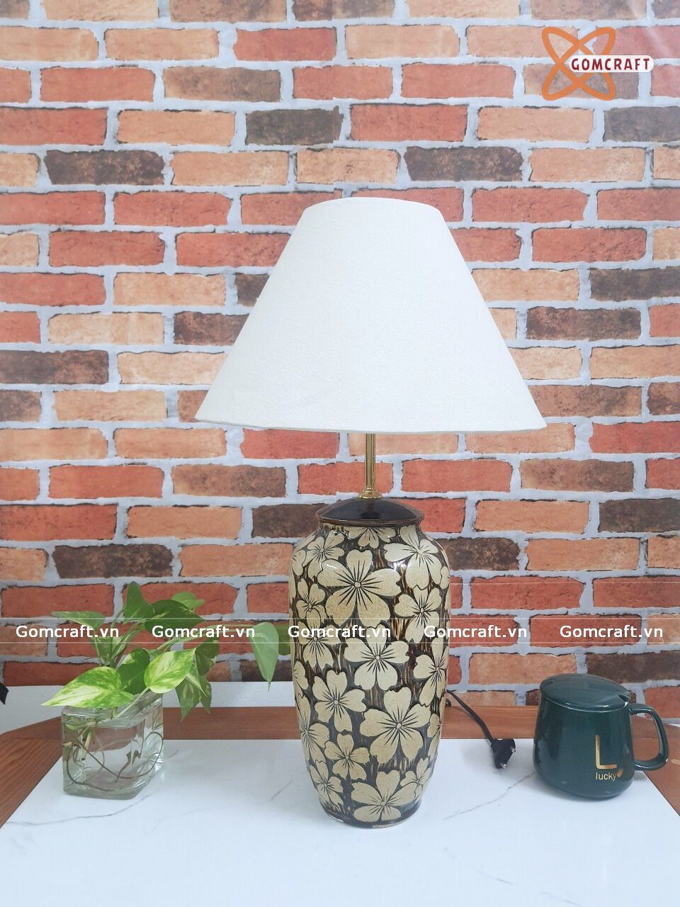 Quà Sinh Nhật | Đèn Trang Trí Phòng Ngủ Gốm sứ Bát Tràng dáng bom họa tiết giả gỗ khắc hoa mai thủ công