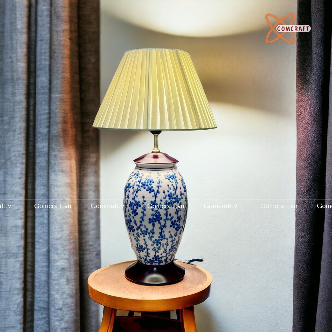Quà Sinh Nhật | Đèn trang trí phòng ngủ Gốm sứ Bát Tràng vuốt tay dáng bí vẽ Nụ Tầm Xuân men lam cao 58cm