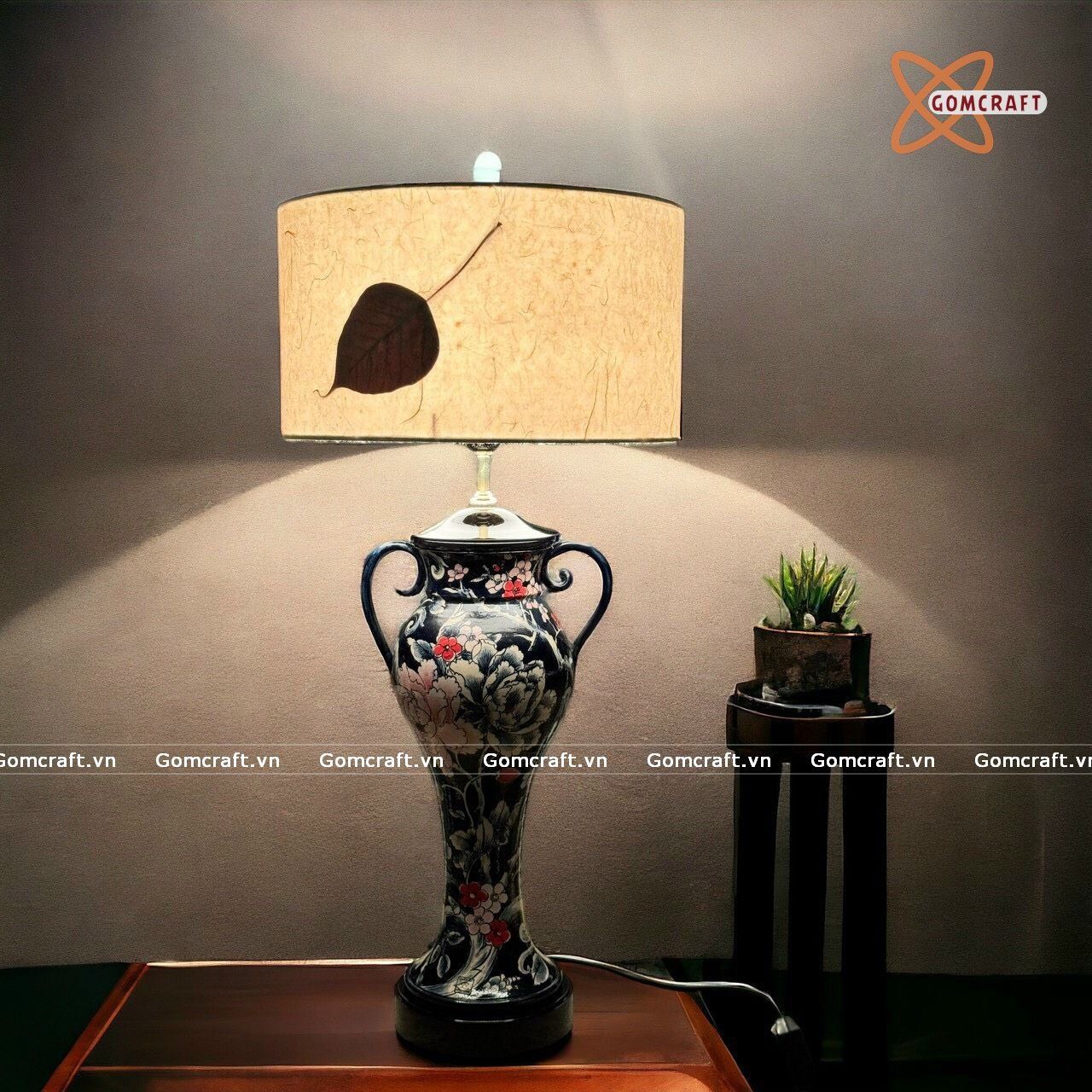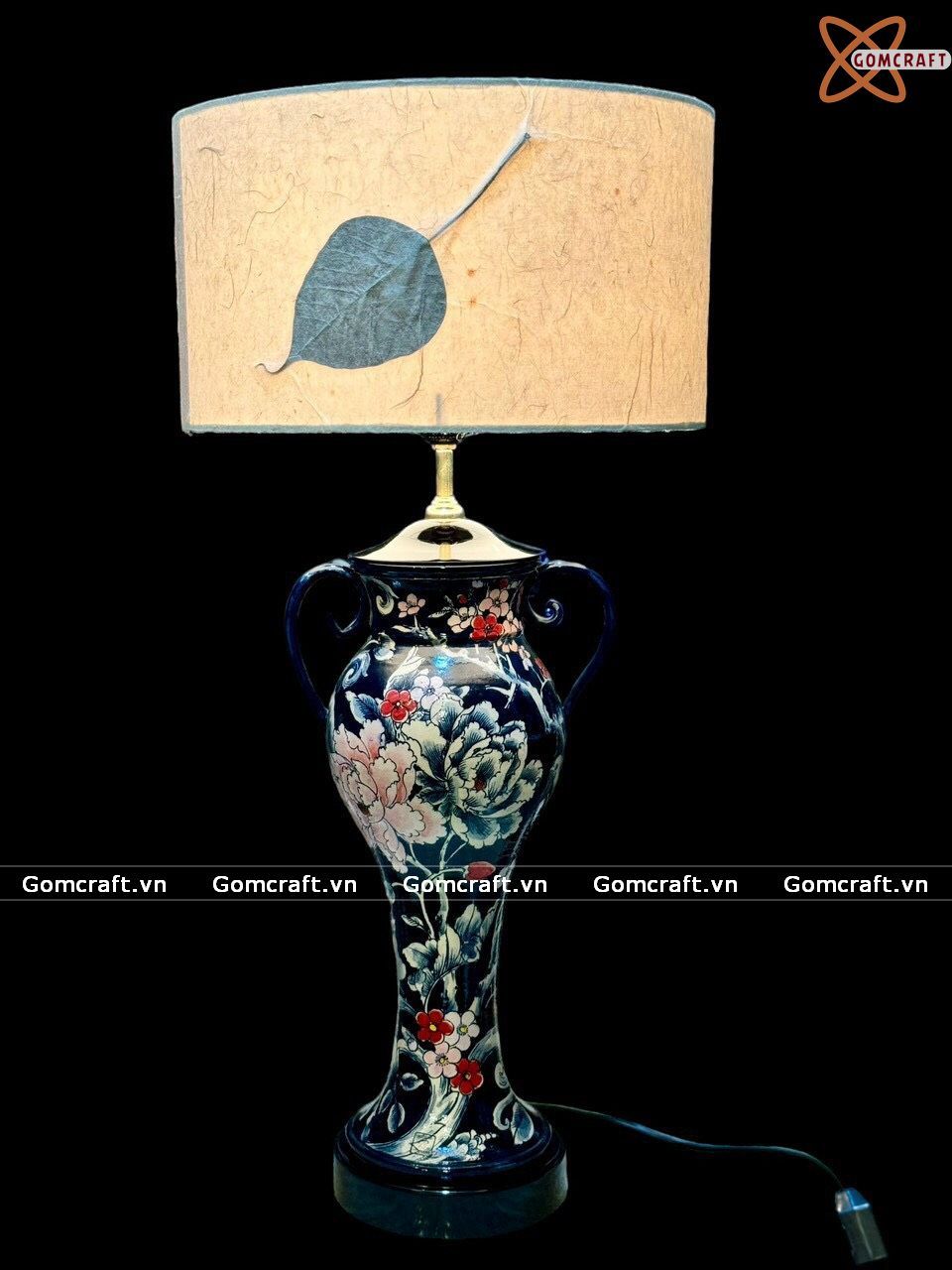 Quà Sinh Nhật | Đèn trang trí phòng ngủ Gốm sứ Bát Tràng vuốt tay dáng ly tai vẽ Hoa Phù Dung độc bản cao 64cm