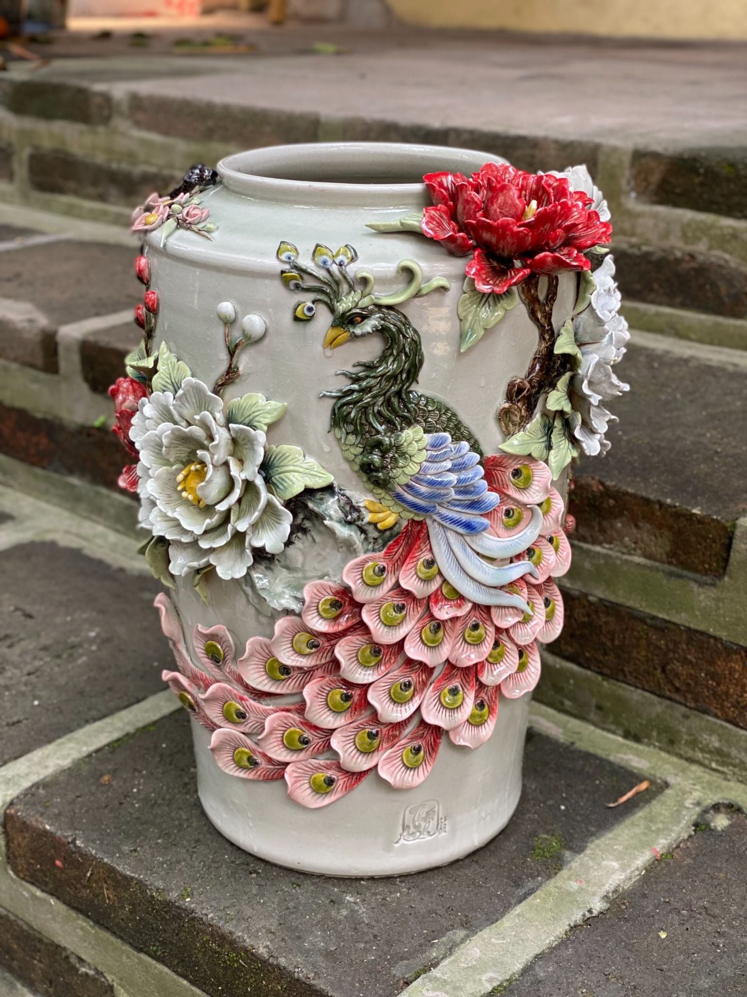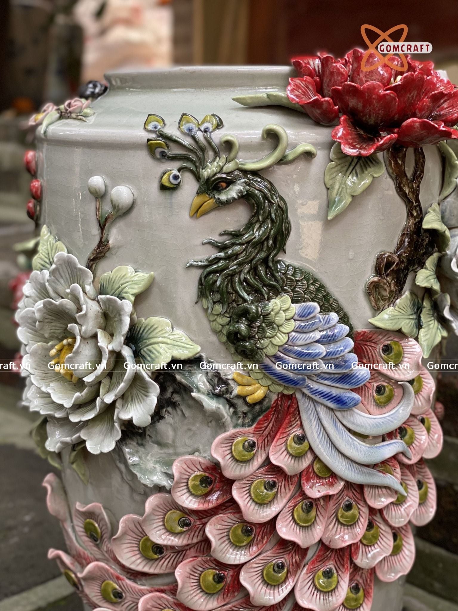 Quà Tặng bình hoa Bát Tràng | Bình Hoa vuốt tay men Màu đắp nổi họa tiết Công Hoa Phú Quý cao 39cm miệng 15cm