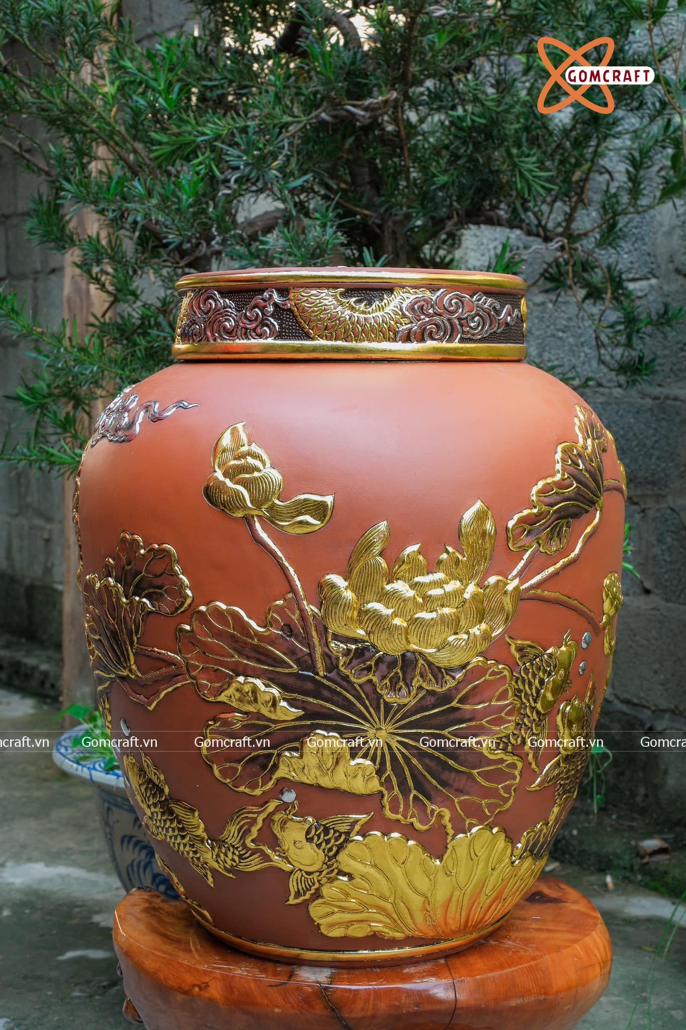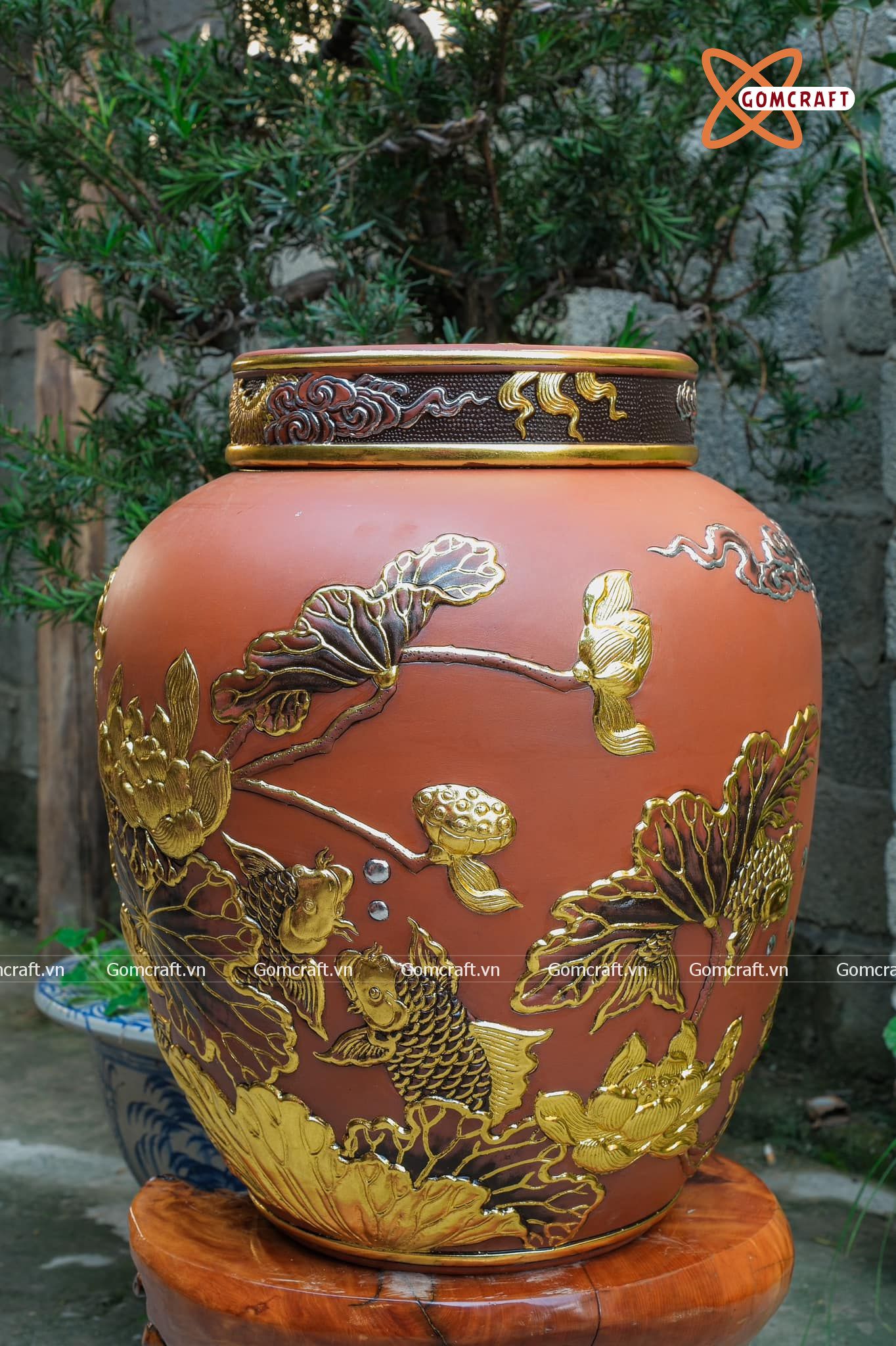 Quà tặng Bố Chum sành đắp nổi dát vàng Cá Chép Vượt Vũ Môn dung tích 100l