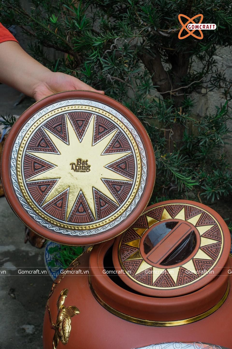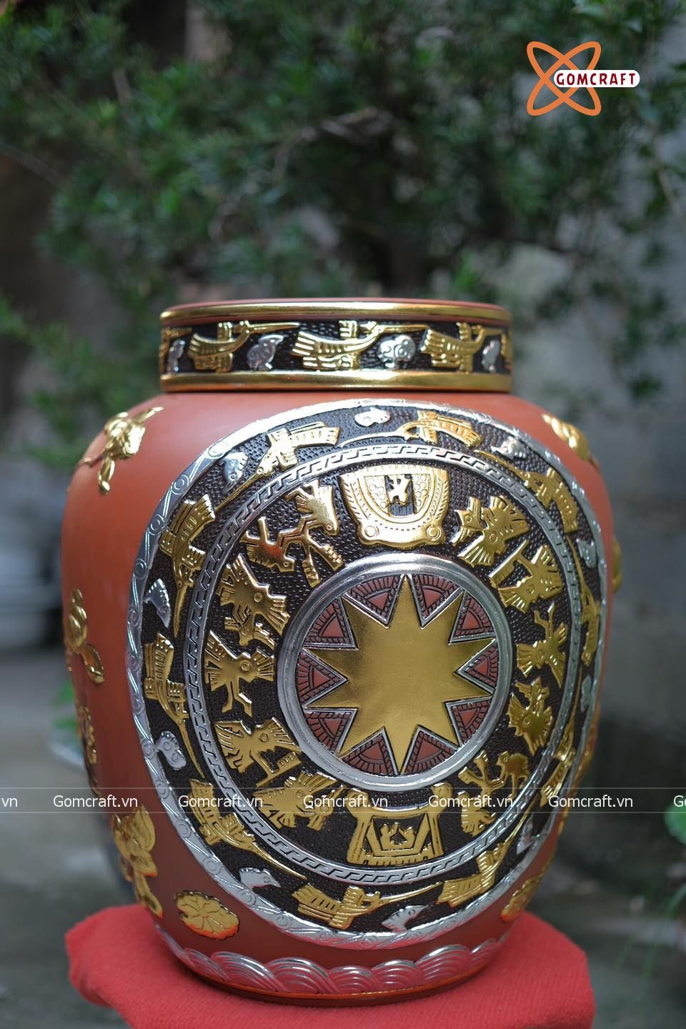 - Họa tiết tinh tế độc đáo: Chum được trang trí với nhiều họa tiết hoa văn mang ý nghĩa tốt lành, như họa tiết đông sơn, họa tiết cổ, chữ Tài Lộc v.v.. Một số chum còn được dát vàng 24K hoặc vẽ vàng 24K để tăng thêm vẻ sang trọng và quý phái.