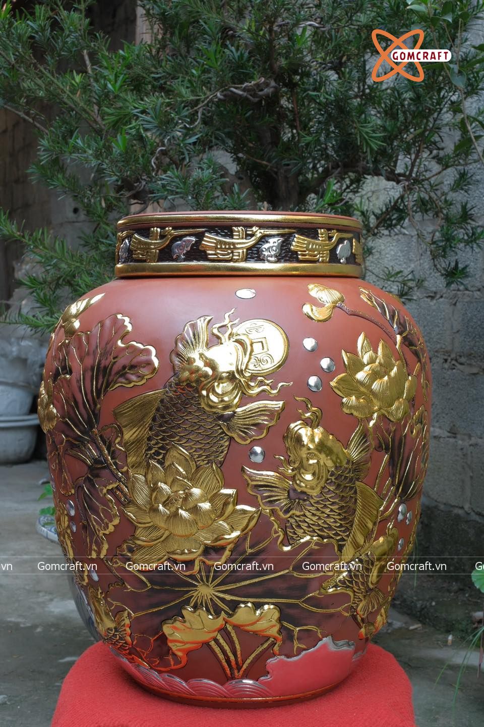 Quà tặng Bố Chum sành đắp nổi dát vàng Cá Chép Vượt Vũ Môn mặt Trống Đồng dung tích 50l