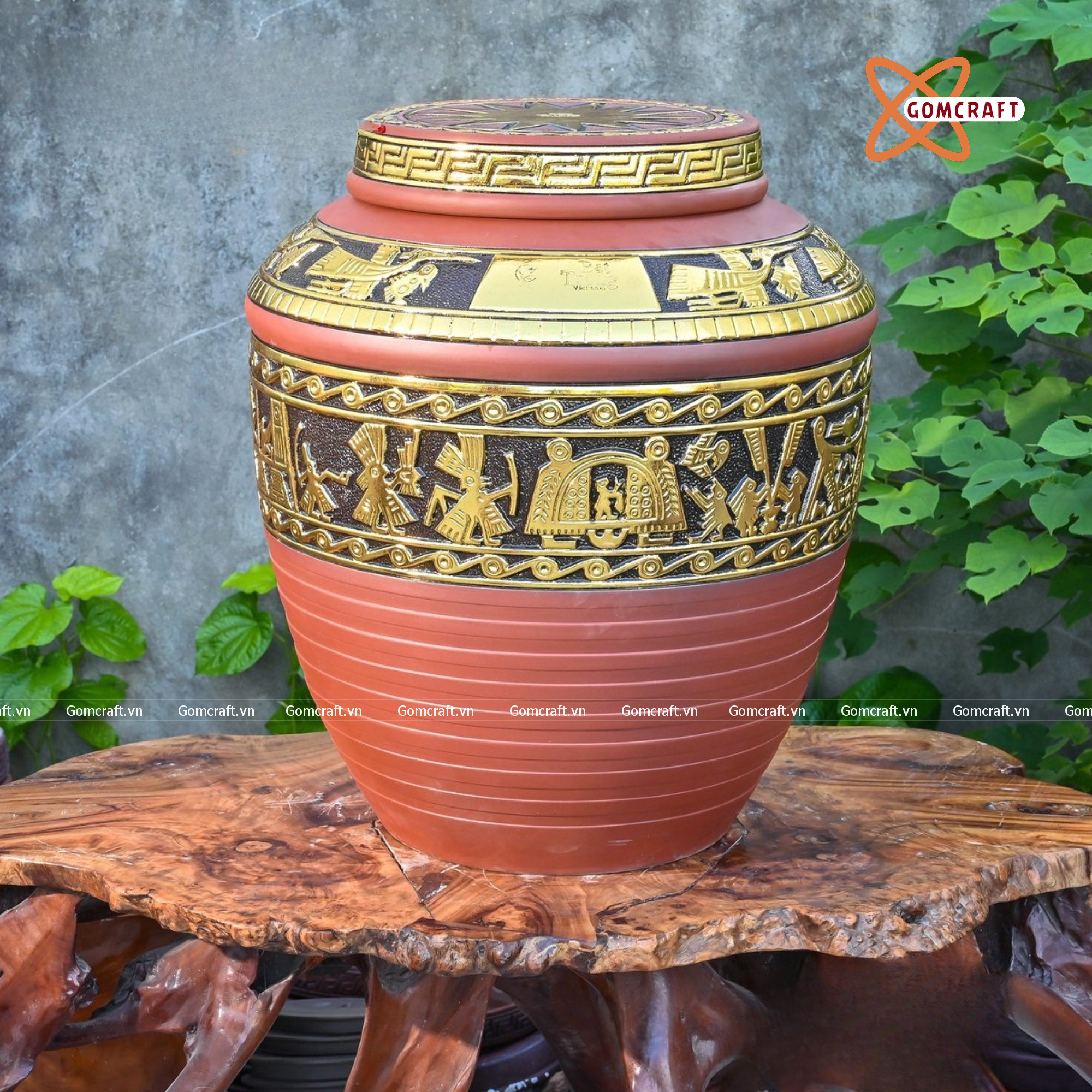 Quà tặng Bố Chum sành đắp nổi dát vàng Trống Đồng Âu Lạc dung tích 50l