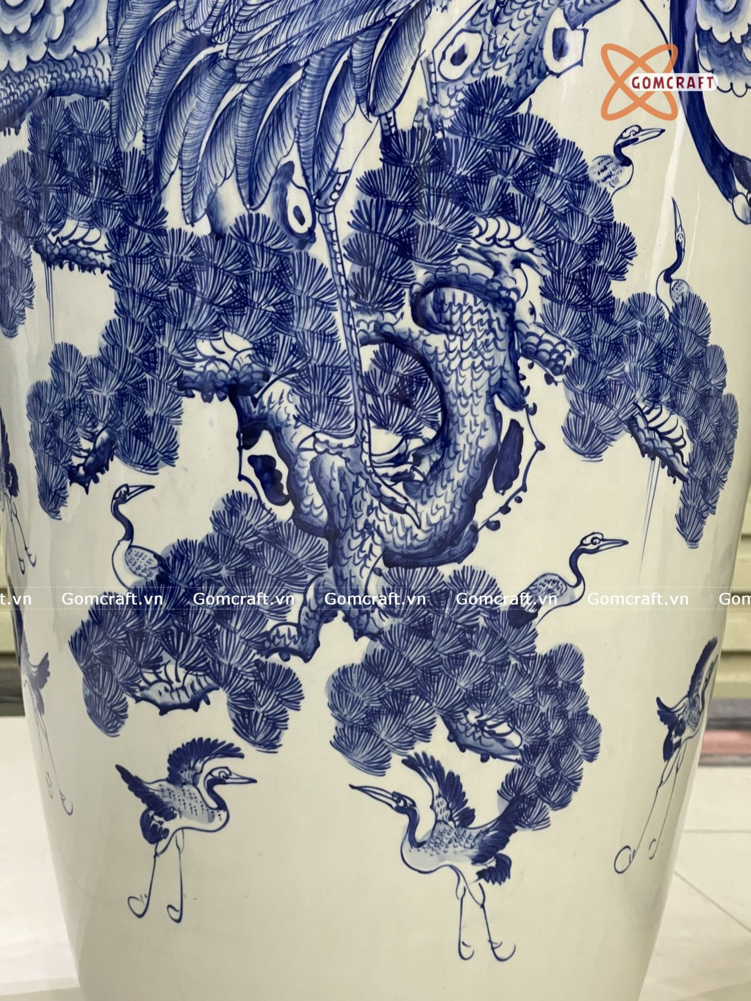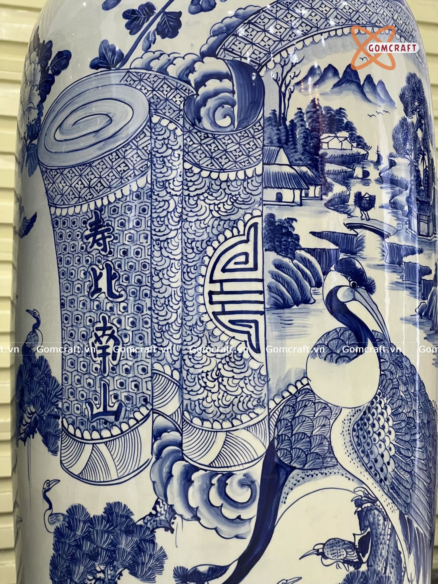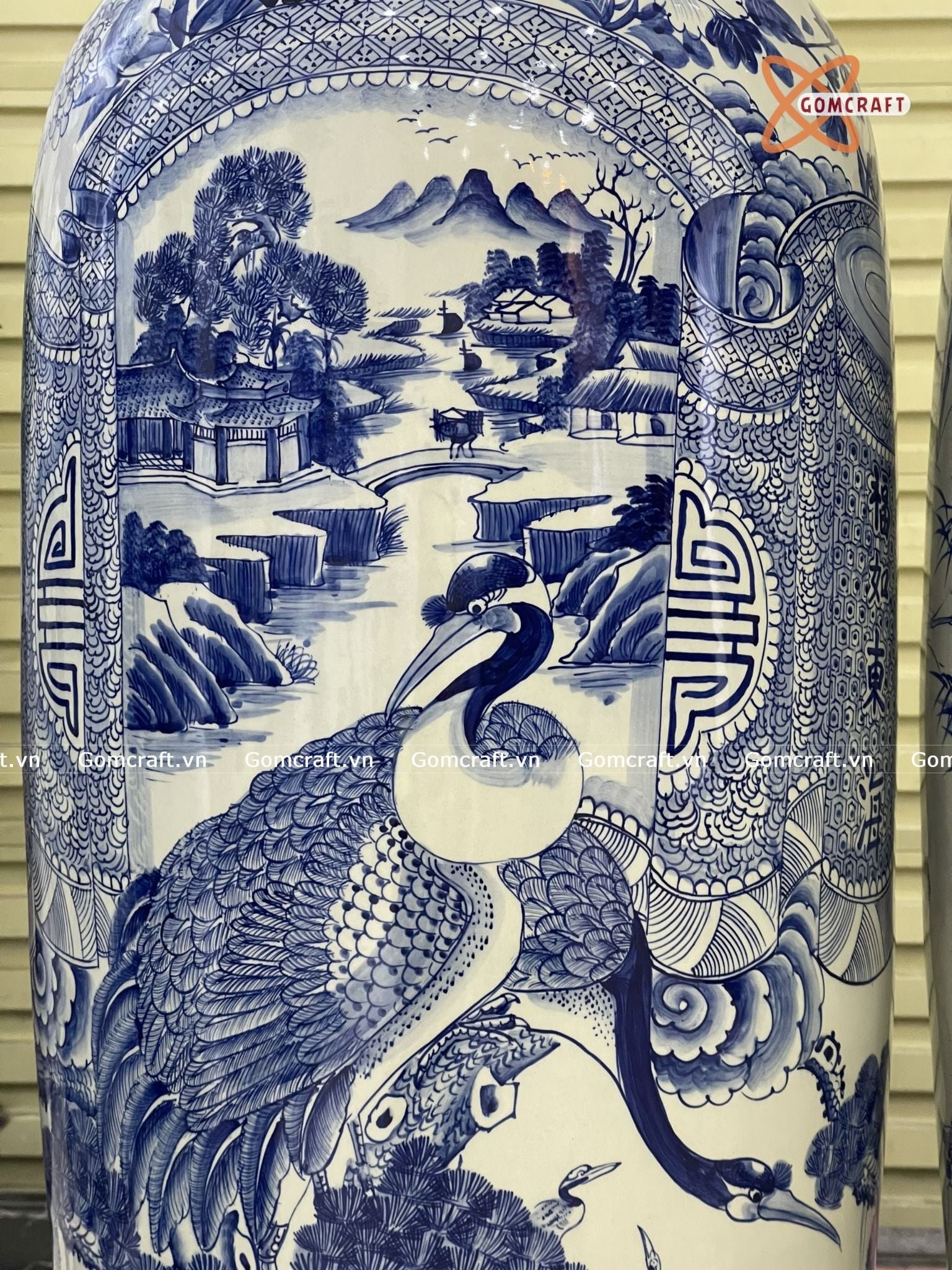 Quà Tặng Bố lục bình Bát Tràng | Lục Bình Bát Tràng men lam vẽ Cuốn Thư Tùng Hạc cao 1m4 bụng 40cm