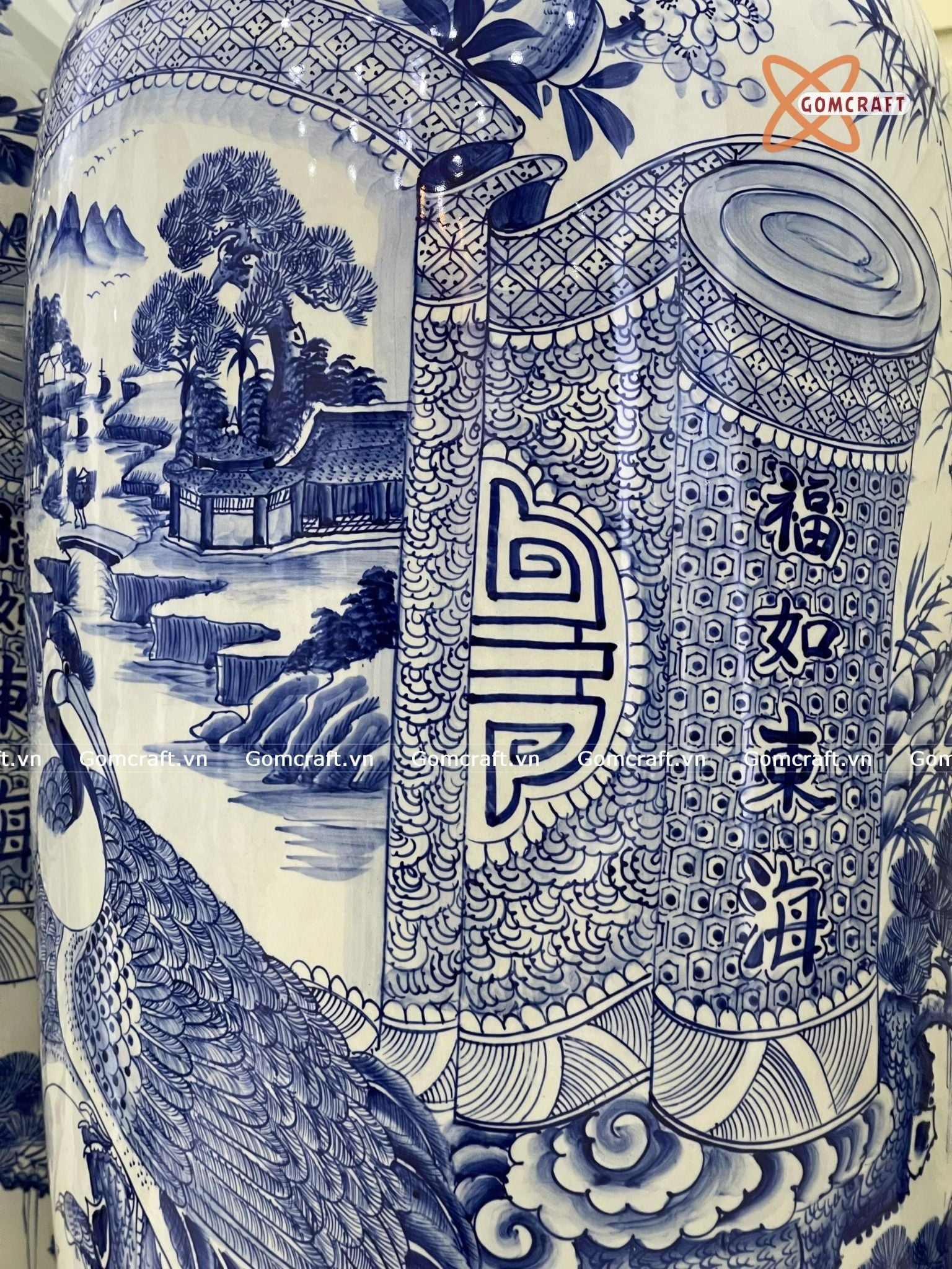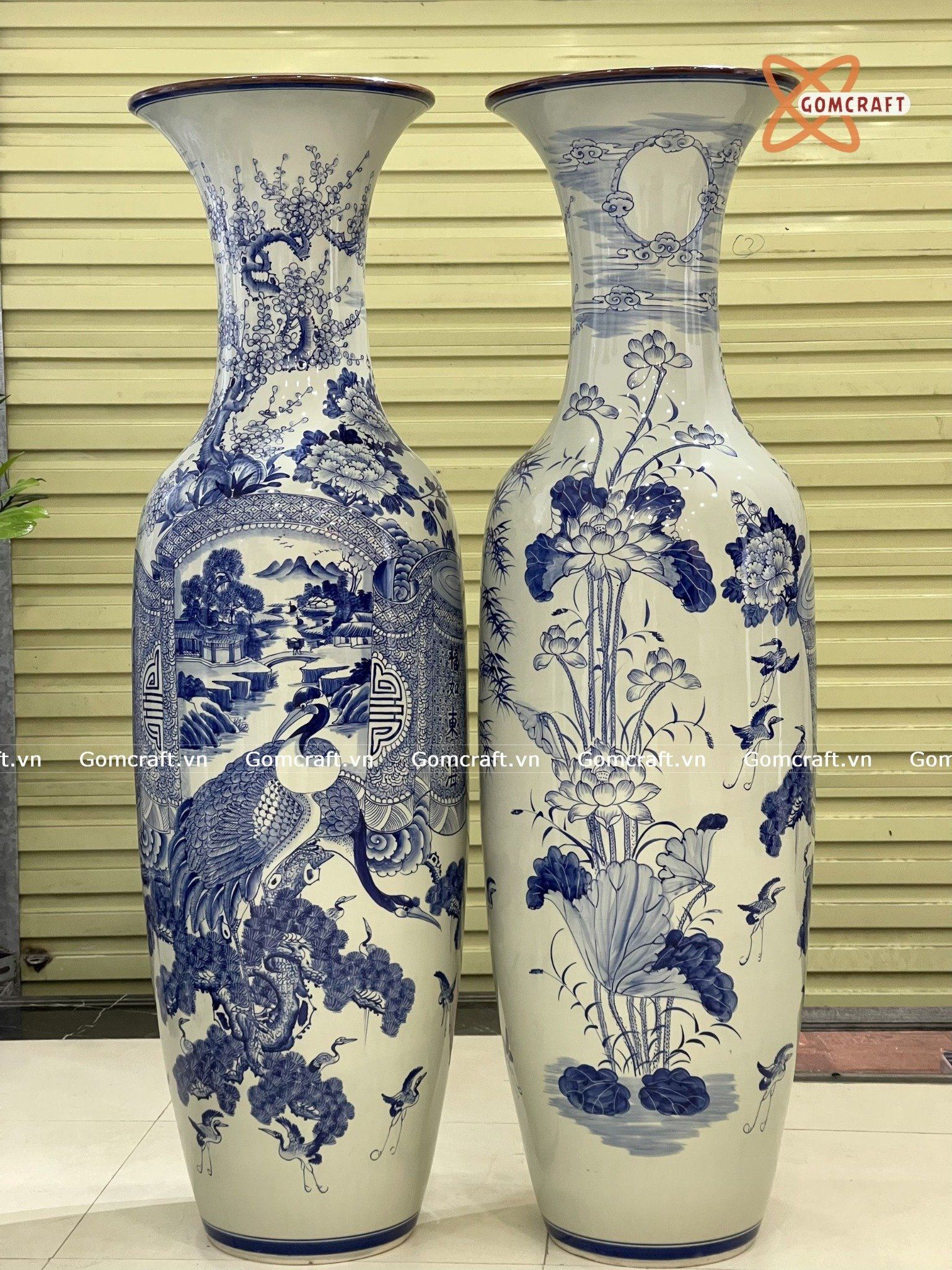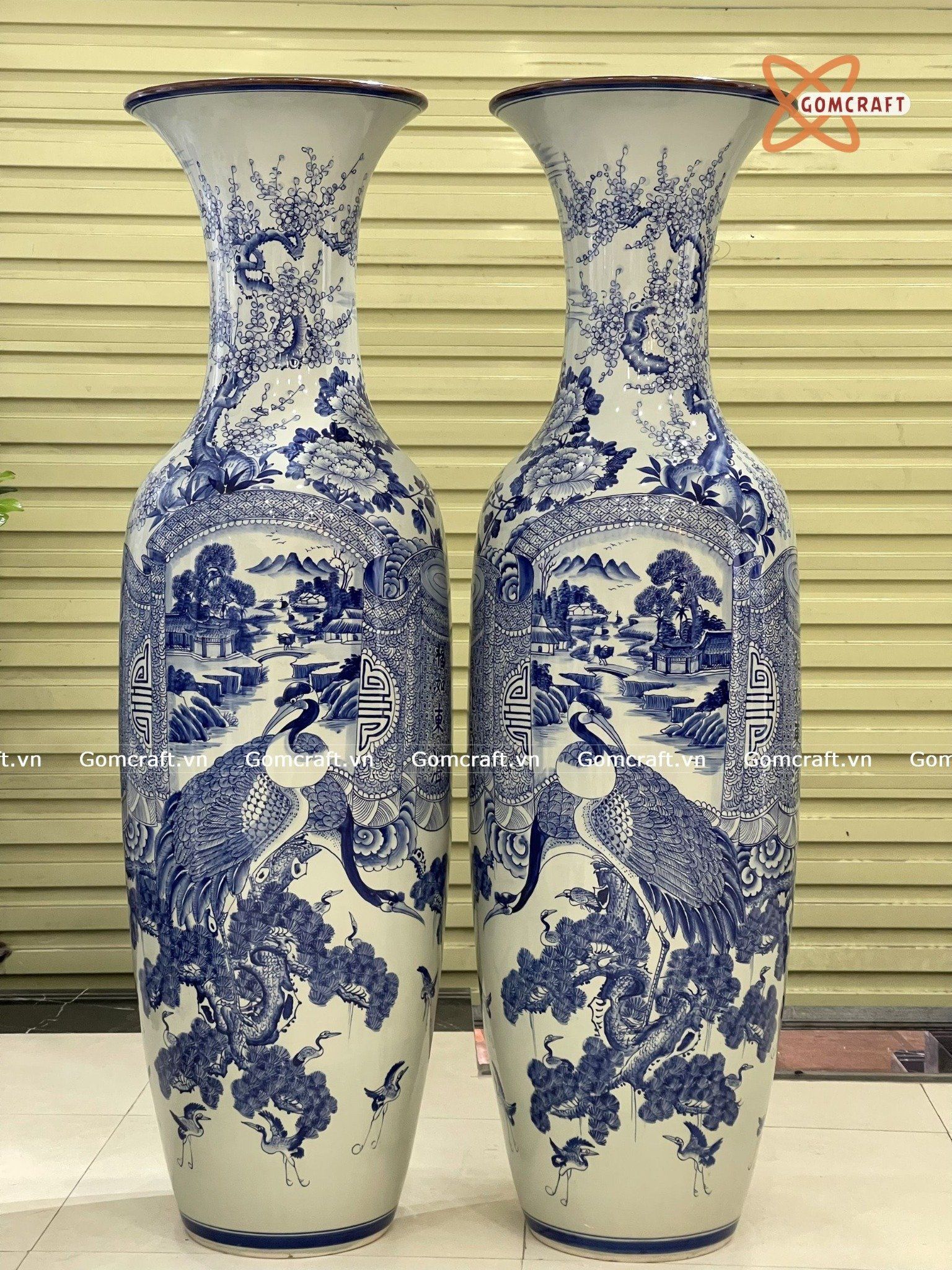 Quà Tặng Bố lục bình Bát Tràng | Lục Bình Bát Tràng men lam vẽ Cuốn Thư Tùng Hạc cao 1m4 bụng 40cm