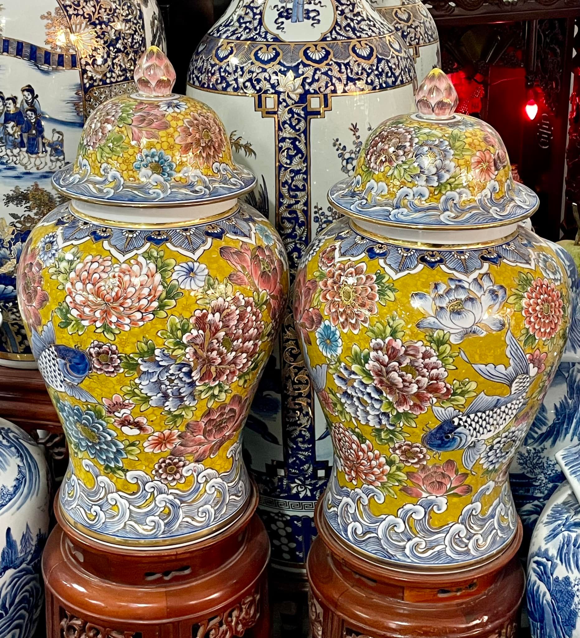 Cặp chóe này có thể đặt ở 2 bên của bàn thờ tổ tiên hoặc ngay 2 bên hông của cửa ra vào phòng thờ. Vị trí này sẽ giúp phòng thờ của nhà các bác trở nên uy nghi, sang trọng hơn.