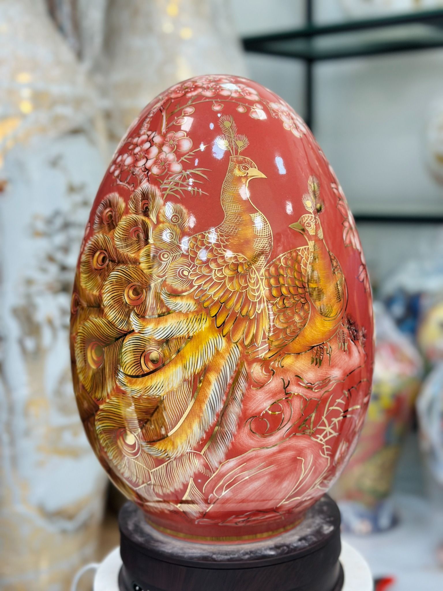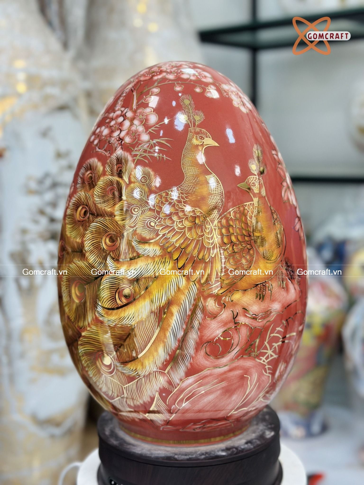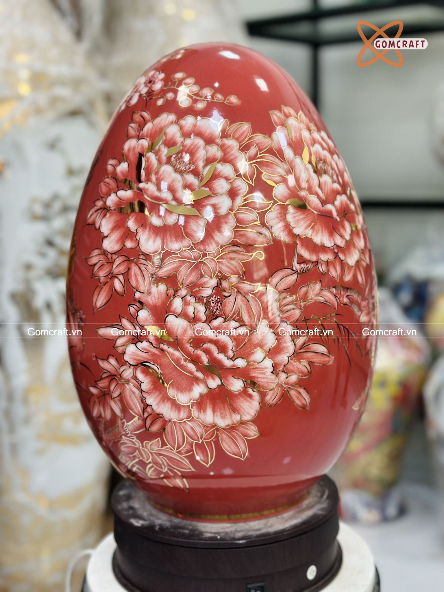 Quà Tặng Cao Cấp Trứng Phong Thủy nền đỏ vẽ Công Danh Phú Quý vẽ vàng cao 40cm bụng 27cm