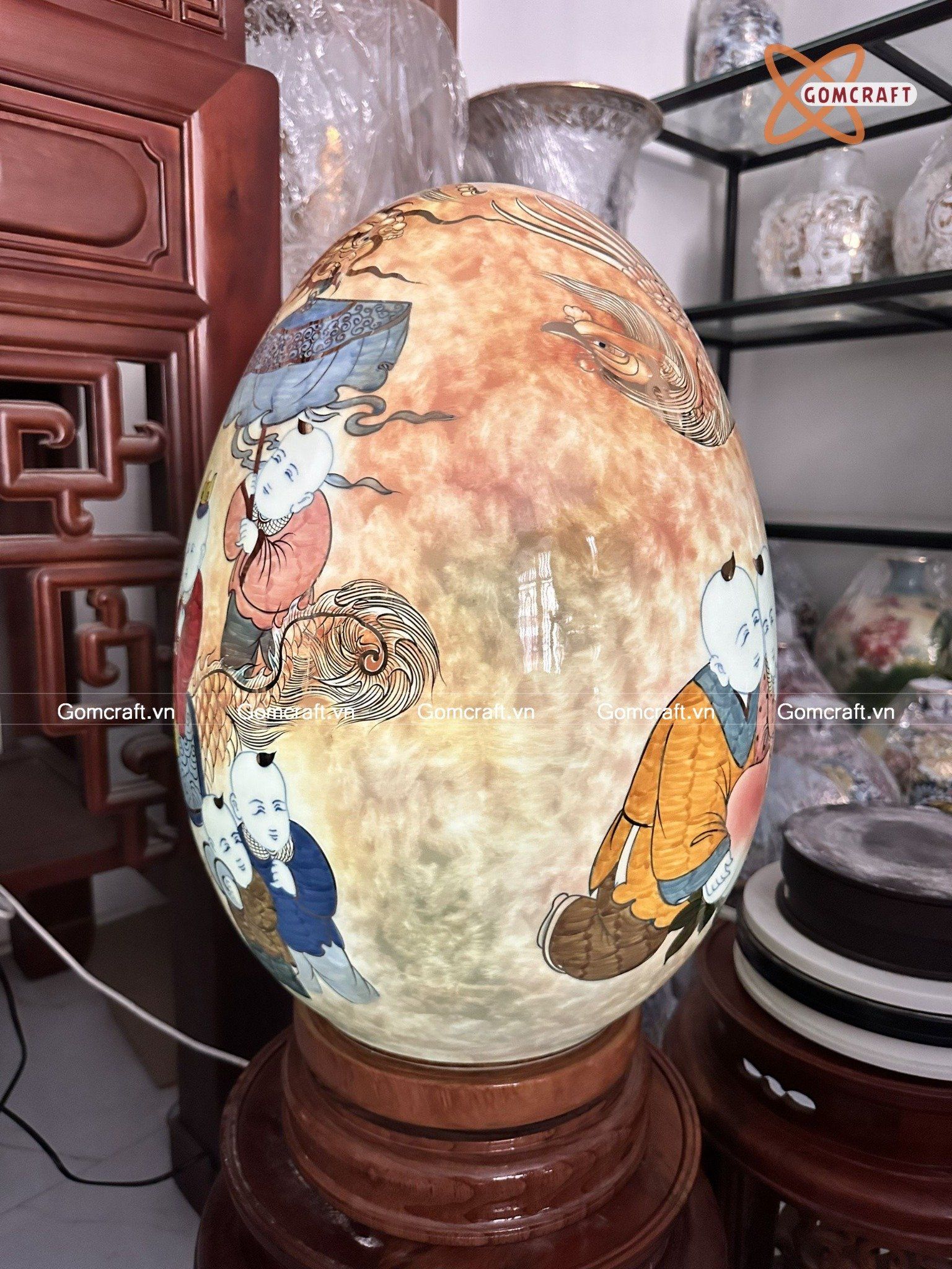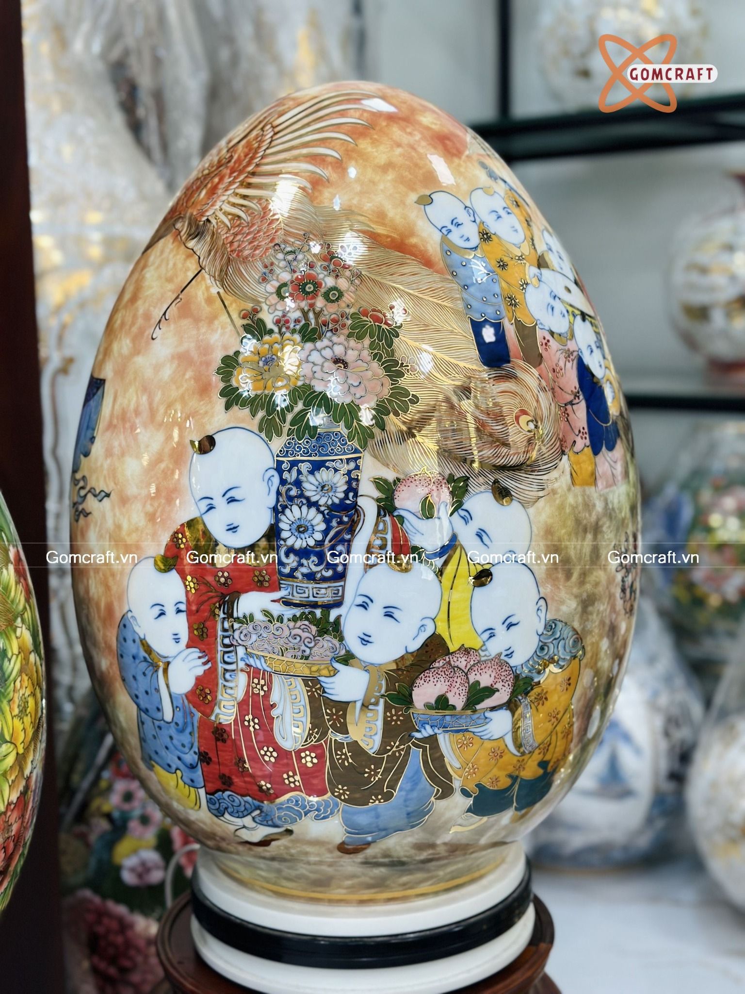 Quà Tặng Cao Cấp Trứng Phong Thủy nền vân đá vẽ màu Bách Nhi Bách Phúc vẽ vàng cao 50cm bụng 38cm