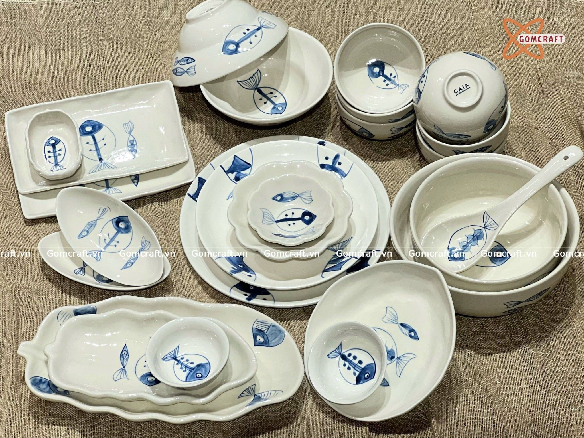 Quà Tặng Doanh Nghiệp bát sứ | Bát Sứ Bát Tràng bộ bát ăn decor gia đình họa tiết Cá Xanh 25 chi tiết