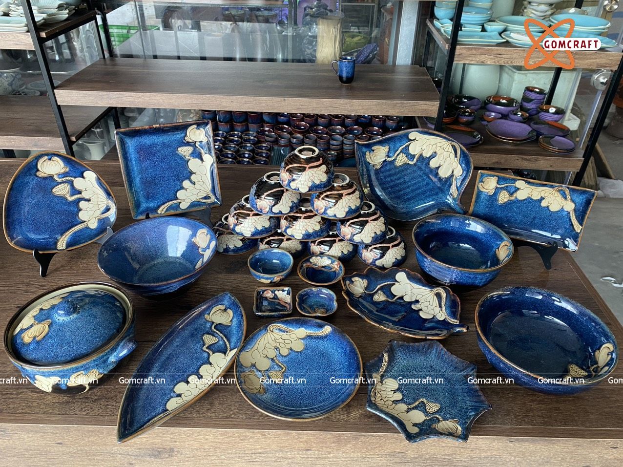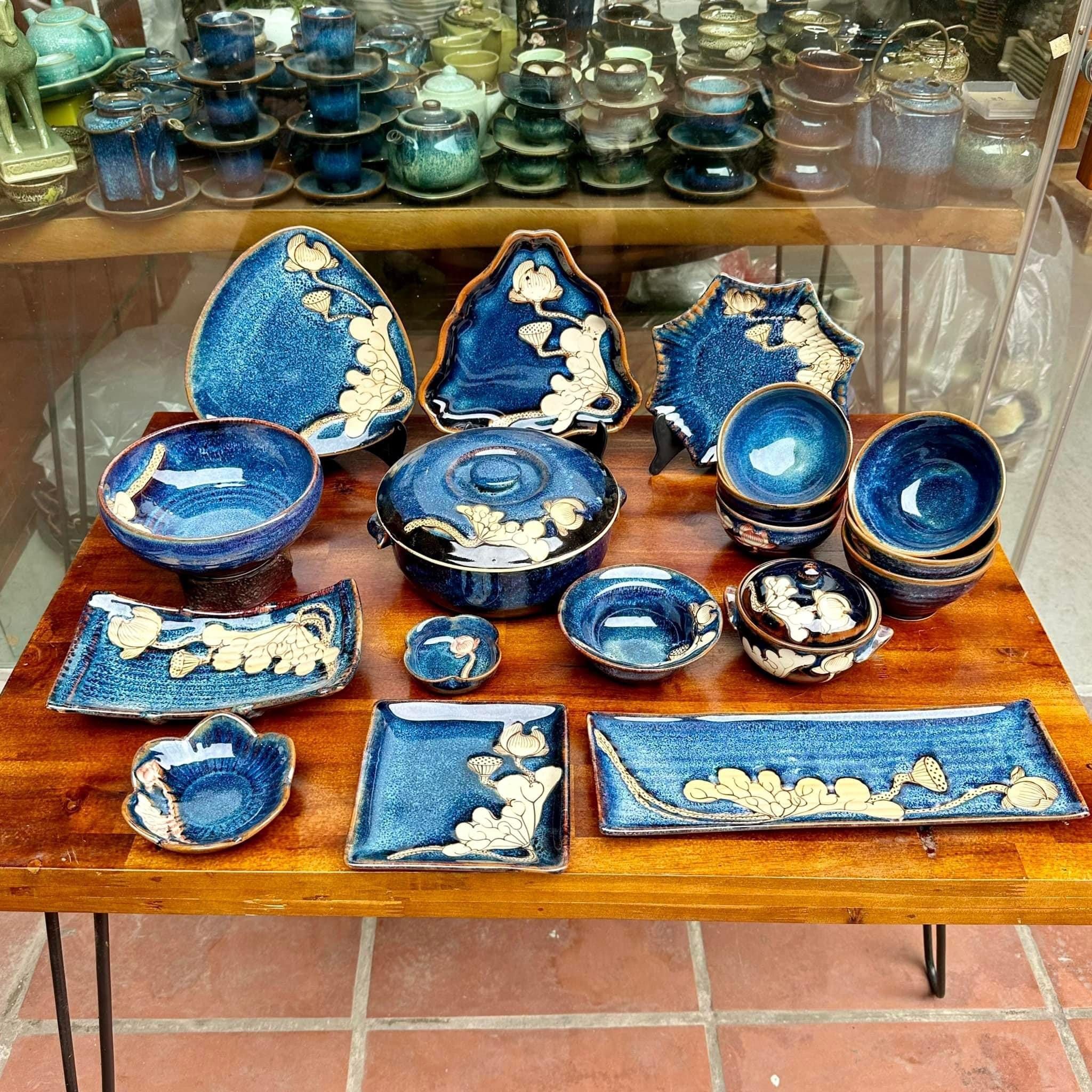 Quà Tặng Doanh Nghiệp bát sứ | Bát Sứ Bát Tràng Bộ Đồ Ăn men hoả biến xanh vẽ sen 26 vật phẩm