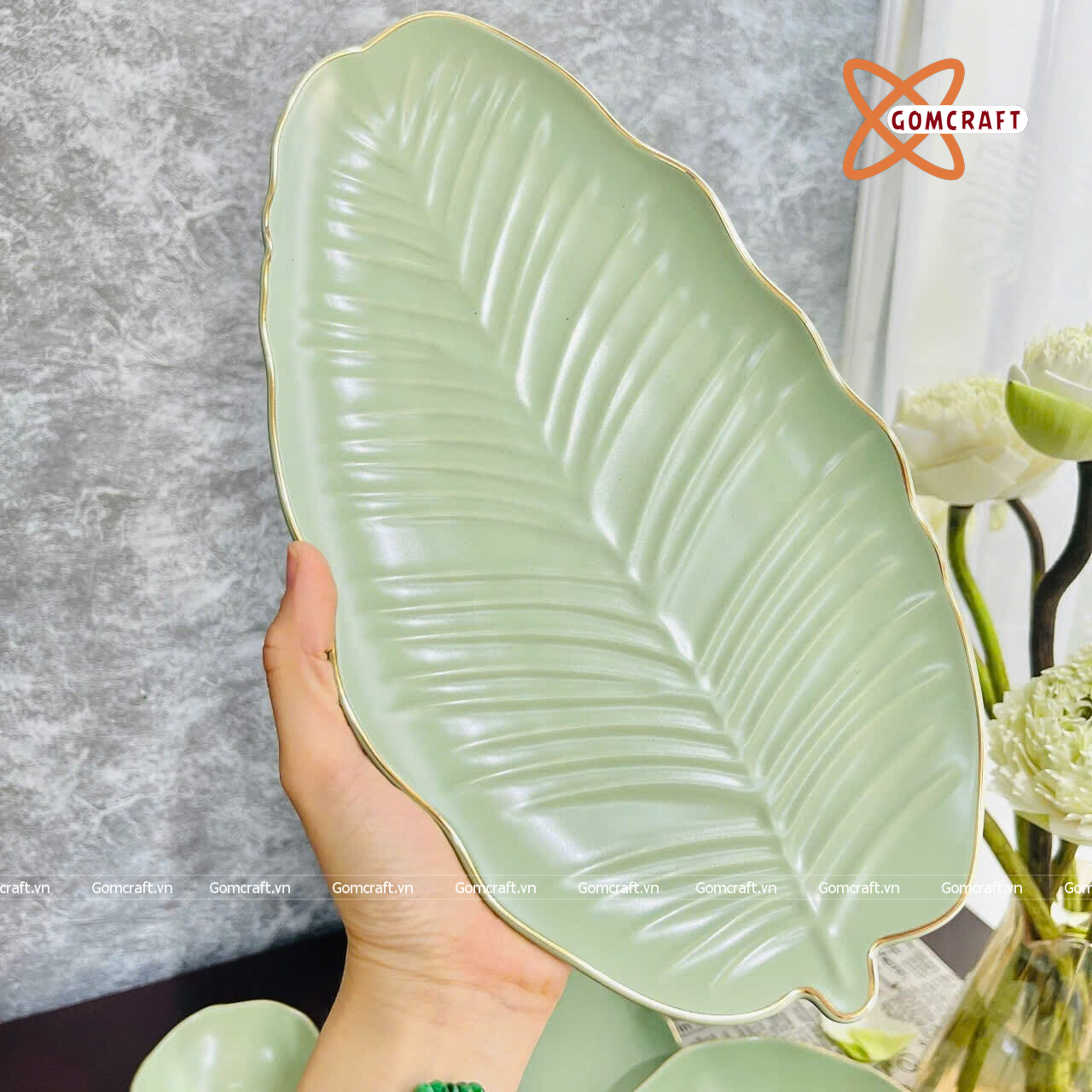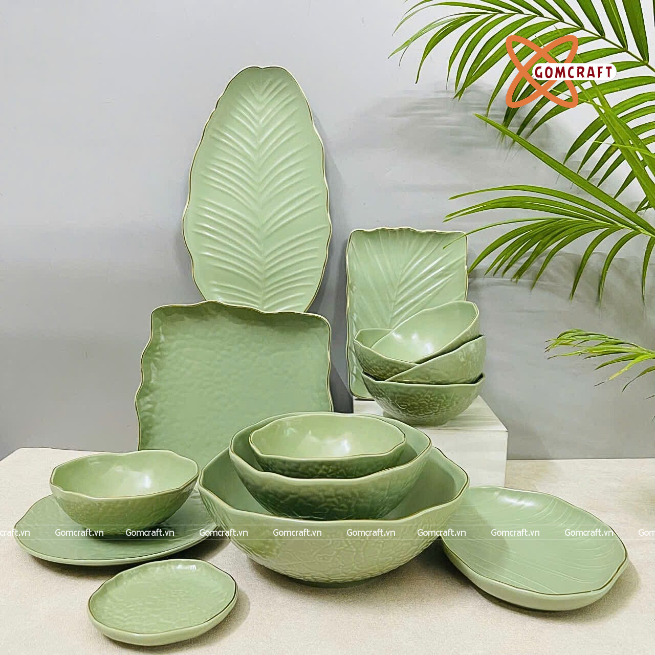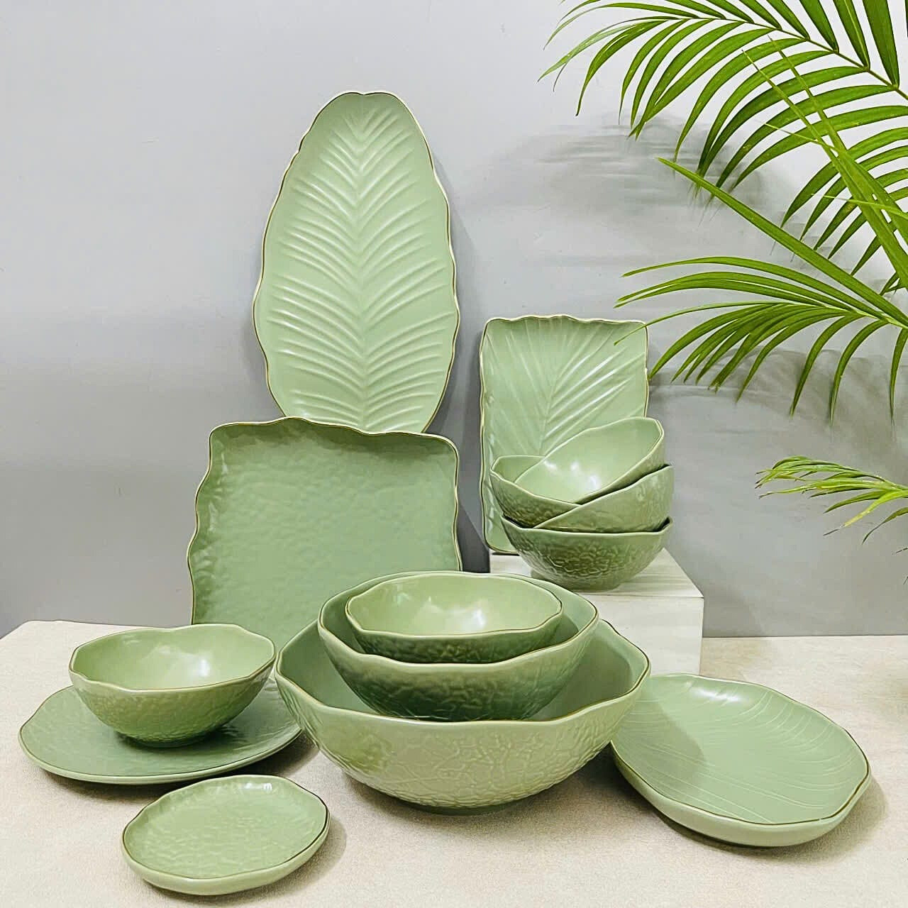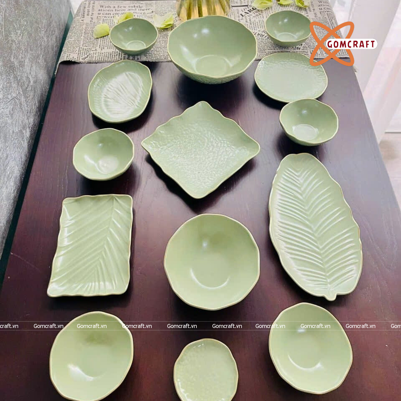 Quà Tặng Doanh Nghiệp bát sứ | Bát Sứ Bát Tràng Bộ Đồ Ăn men xanh chuối 14 sản phẩm