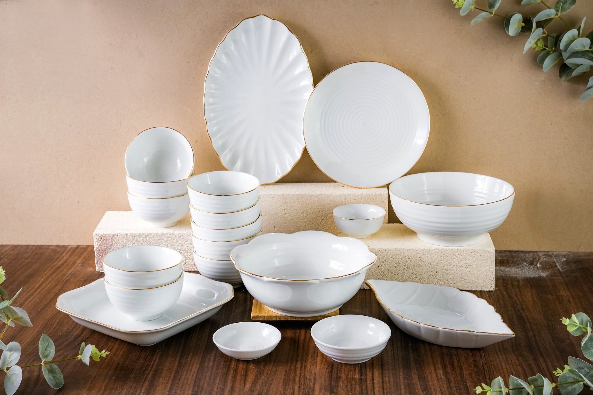 Kích thước | Bộ 19 chi tiết: 10 bát ăn, 2 tô, 1 đĩa lá, 1 đĩa vuông lượn, 1 đĩa bầu dục, 1 đĩa tròn, 1 mắm, 2 muối |