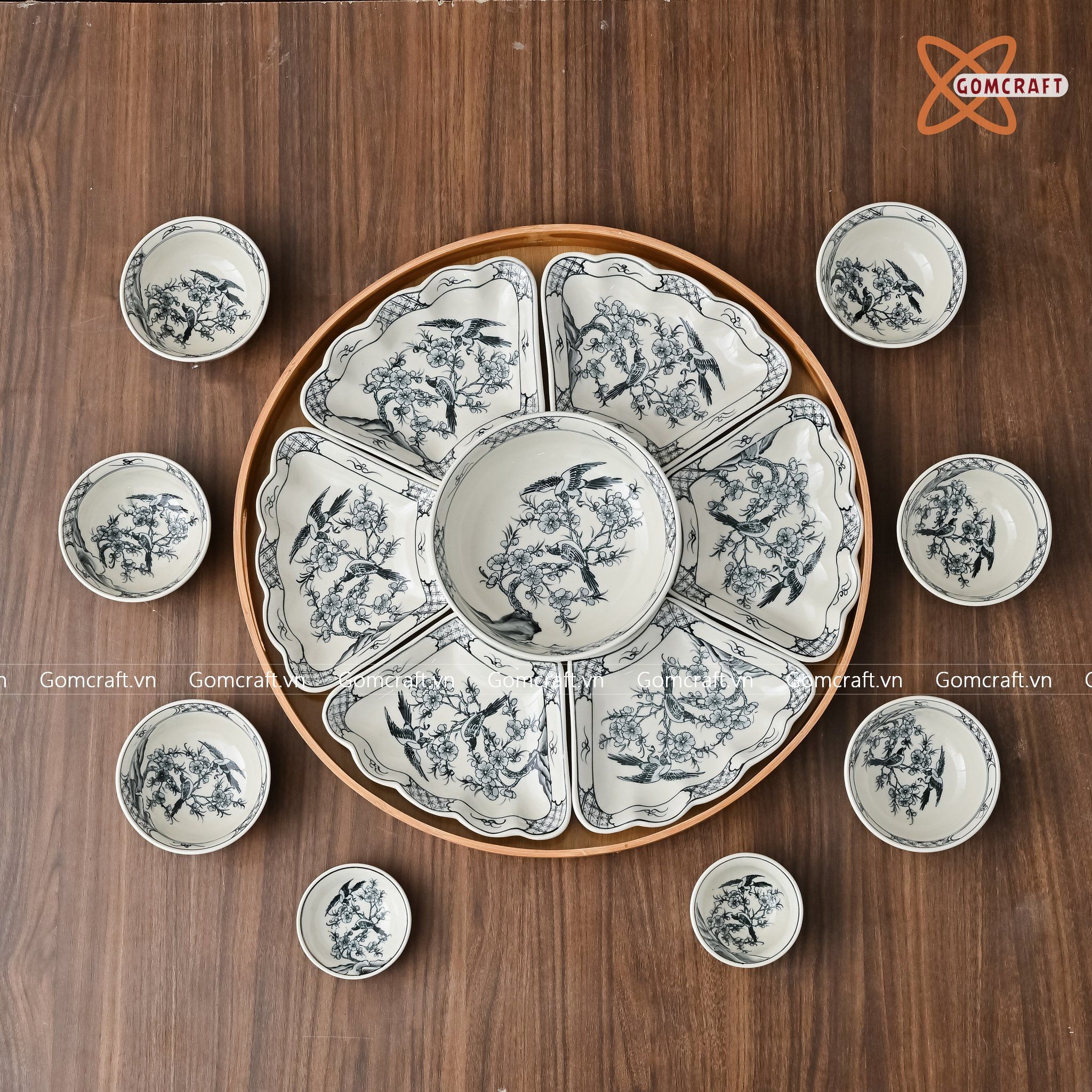 Kích thước | Đường kính 45cm Gồm: 1 bát tô tròn, 6 bát cơm, 6 đĩa, 1 mắm, 1 muối |