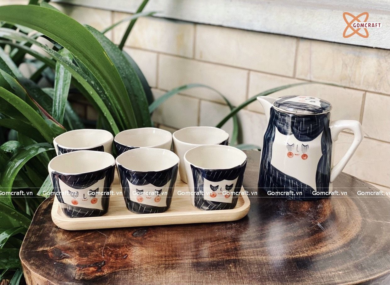 Quà Tặng Doanh Nghiệp bộ ấm chén uống trà | Ấm Chén Bát Tràng vuốt tay decor hiện đại họa tiết Chibi 750ml