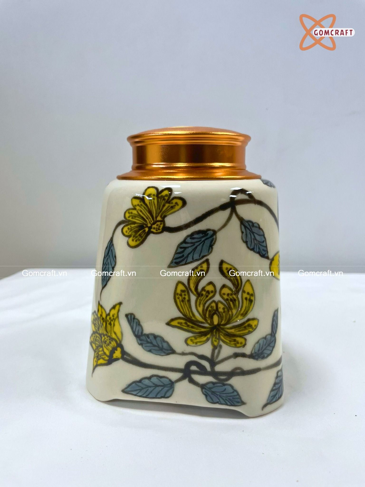 Quà Tặng Doanh Nghiệp Hũ Đựng Trà gốm sứ Bát Tràng cao cấp dáng tròn chân vuông vẽ hoa dây cao 14cm bụng 11cm