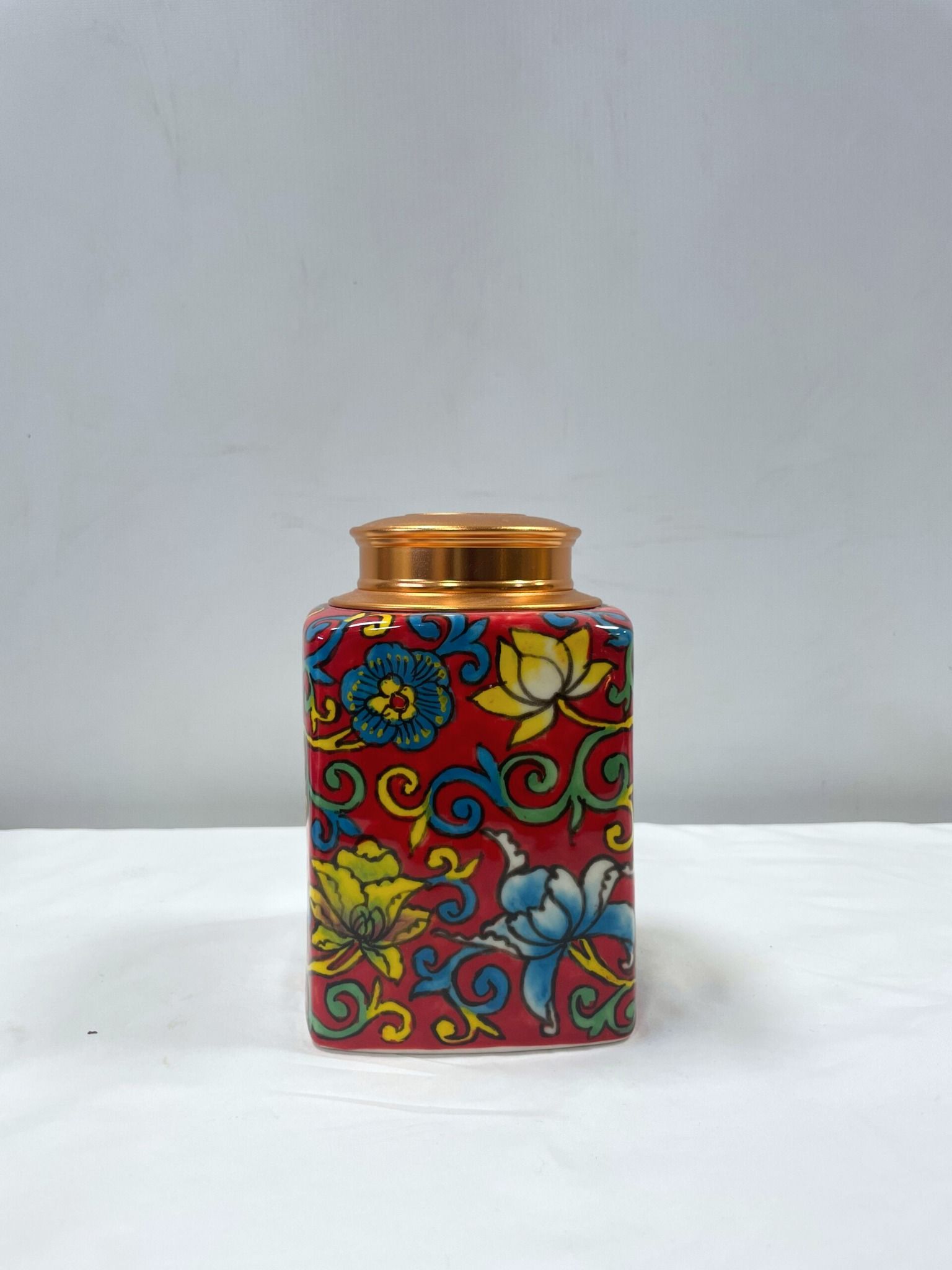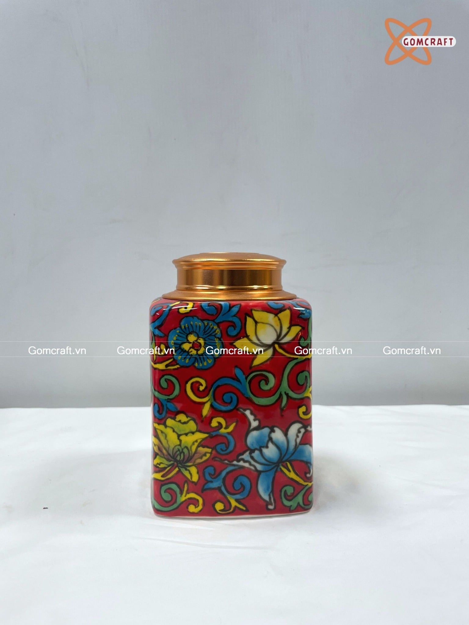 Quà Tặng Doanh Nghiệp Hũ Đựng Trà gốm sứ Bát Tràng cao cấp dáng vuông nền đỏ vẽ hoa dây cao 14cm bụng 10cm