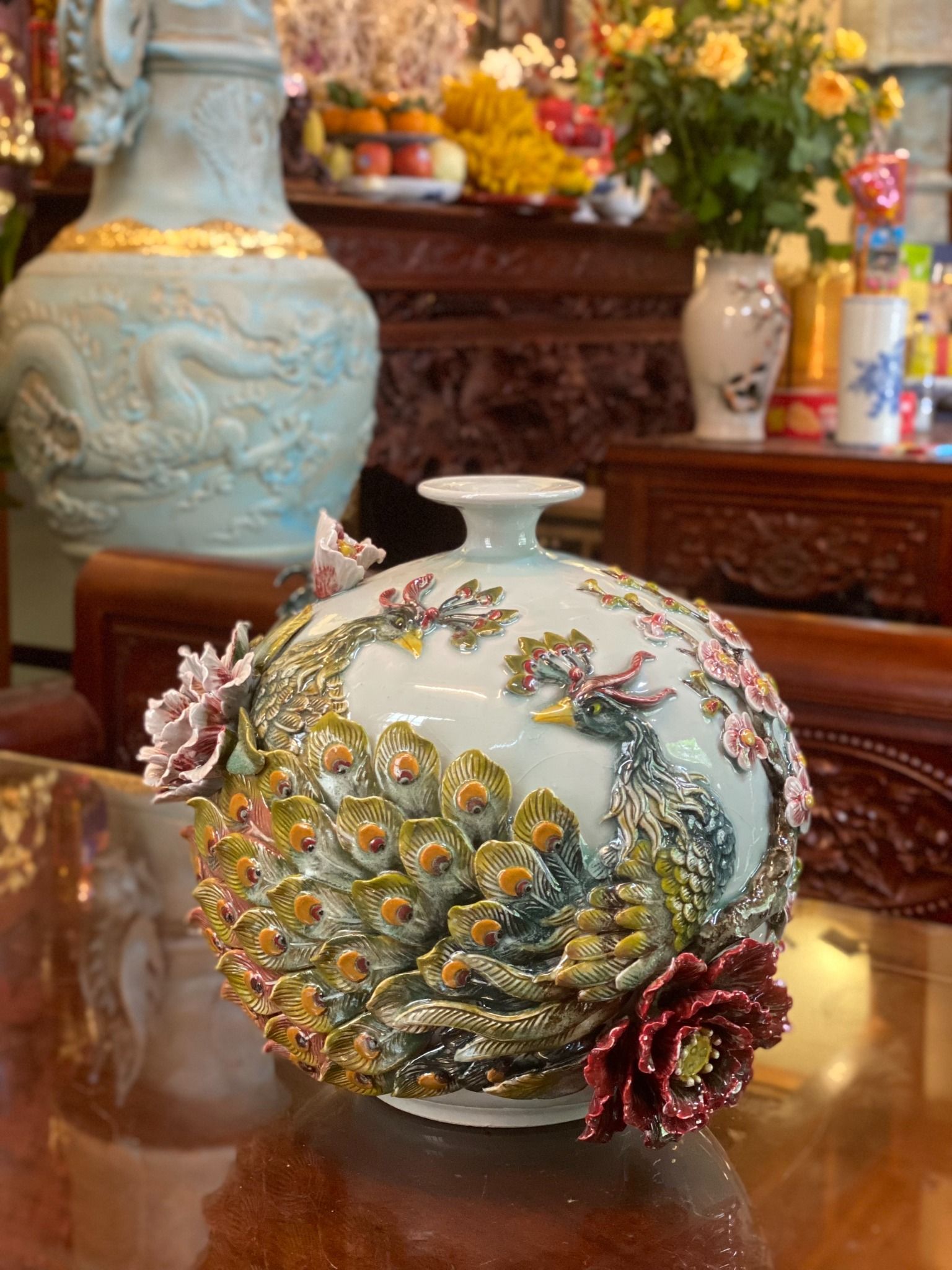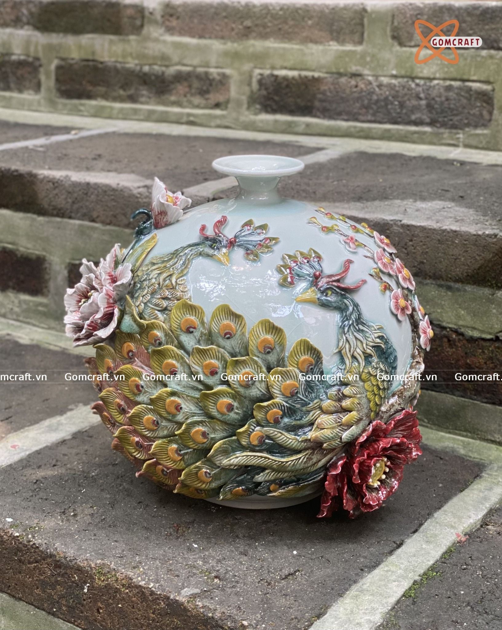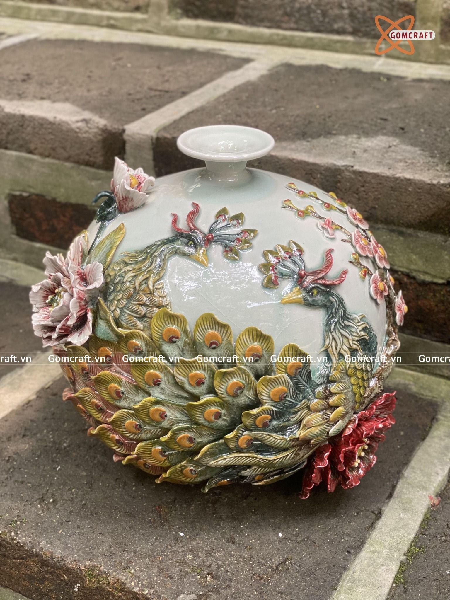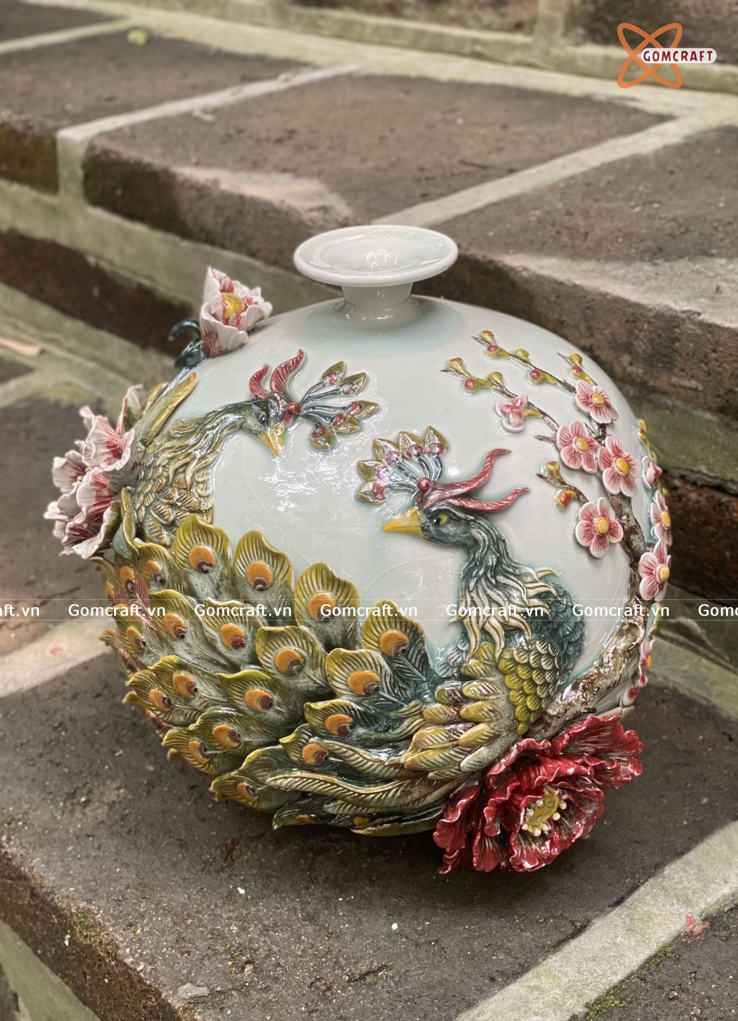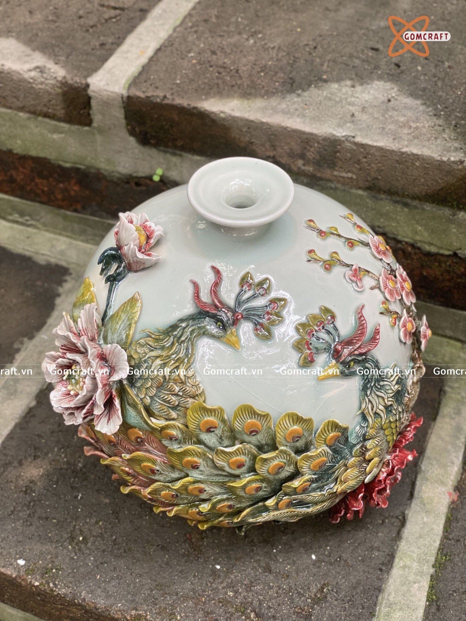 Quà Tặng Khai Trương bình hút lộc Bát Tràng | Bình Hút Lộc men màu đắp nổi Phu Thê Viên Mãn cao 24cm phình 25cm